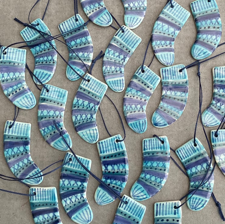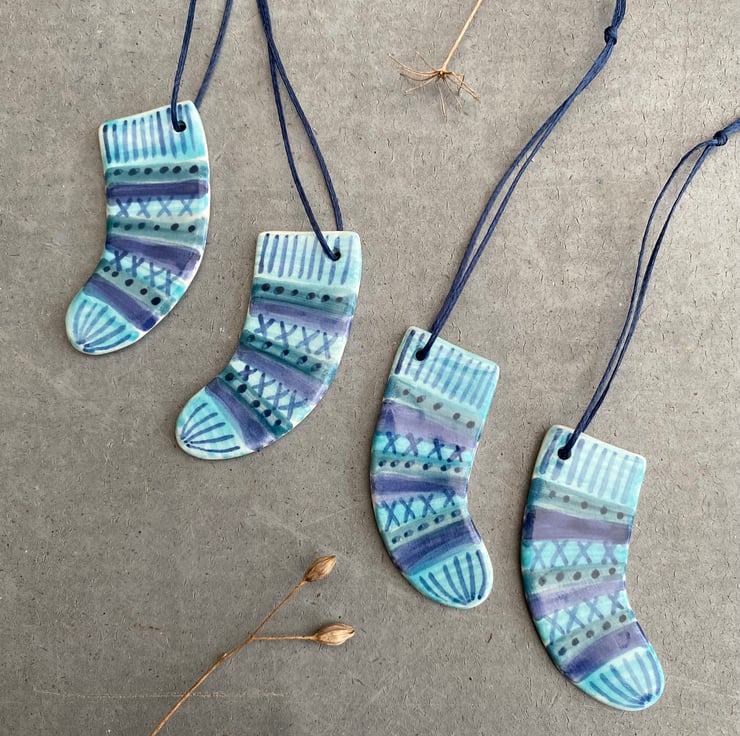 Each decoration is hand made from white earthenware clay, painted with underglaze colours and glazed . Navy cotton thread is attached to allow the decorations to be hung.