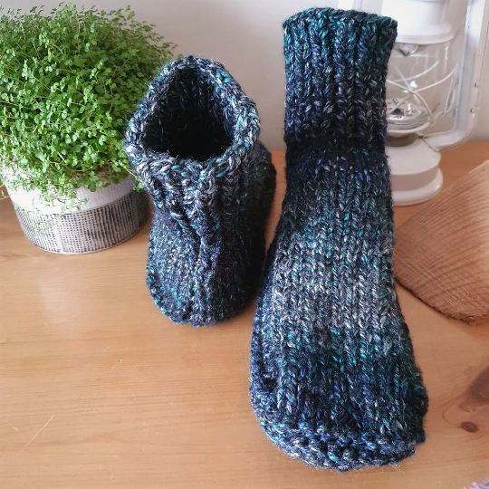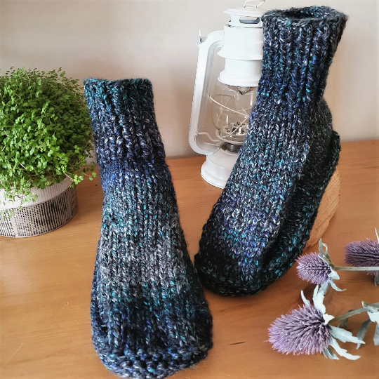 My daughter has perpetually cold feet during the winter months, so I knitted her a pair of these and they worked an absolute treat so I figured we shouldn’t just keep them to ourselves! They’ve been hand knitted with a lovely super cosy, double stranded chunky yarn in a 100% premium acrylic yarn which is predometory black with flecks of teal, blue and silver, giving it a tweed effect. Really thick, soft and cosy.