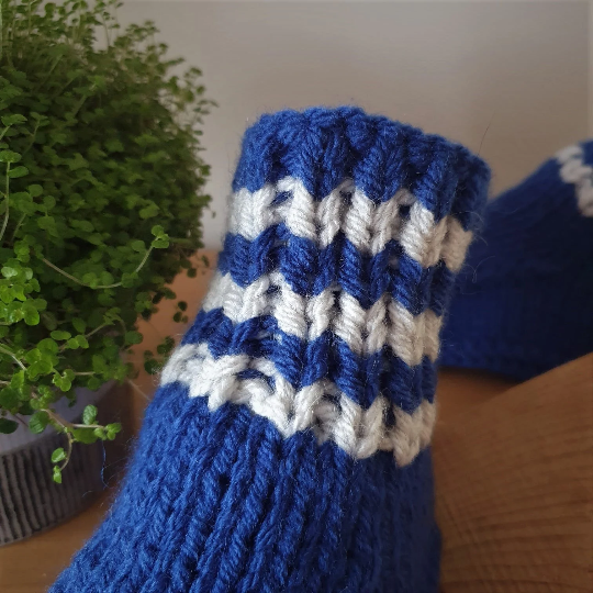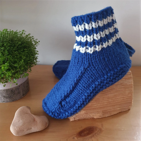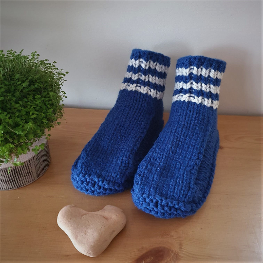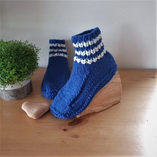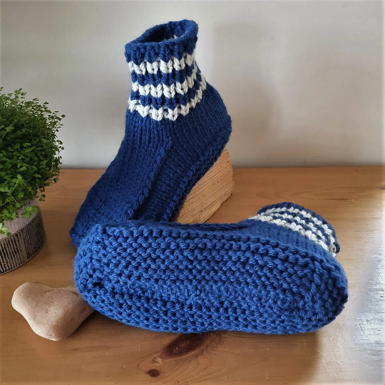 These fabulous slippers have been hand knitted with a wool blend yarn in: