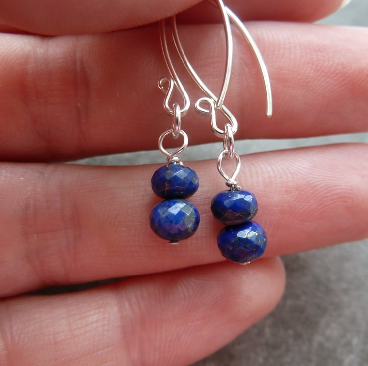 A pair of earrings which feature handmade sterling silver ear wires and Grade AA plus Lapis Lazuli beads.