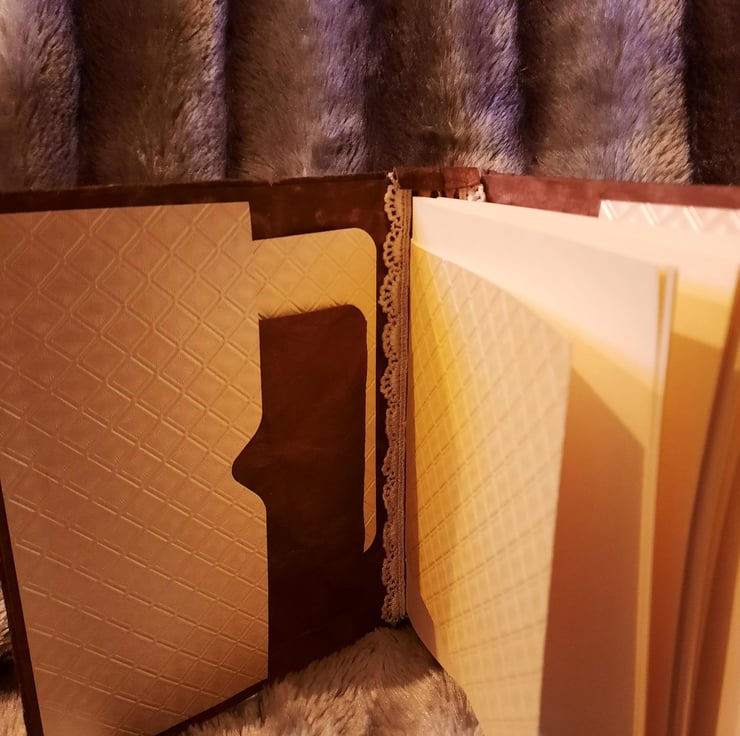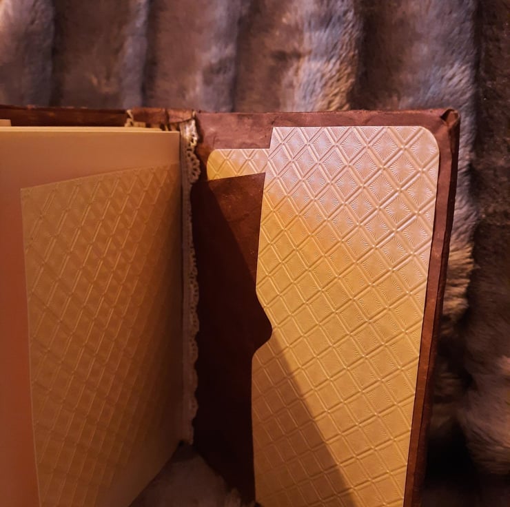 3 signatures inside, each flanked with a beautiful gold quilted effect card stock housing good quality cream paper.