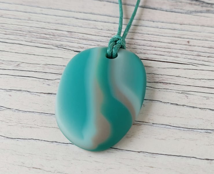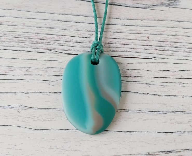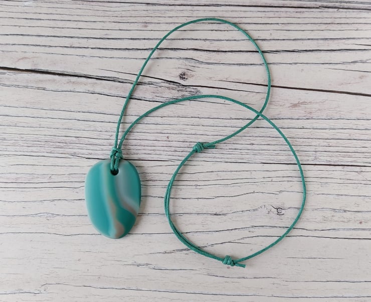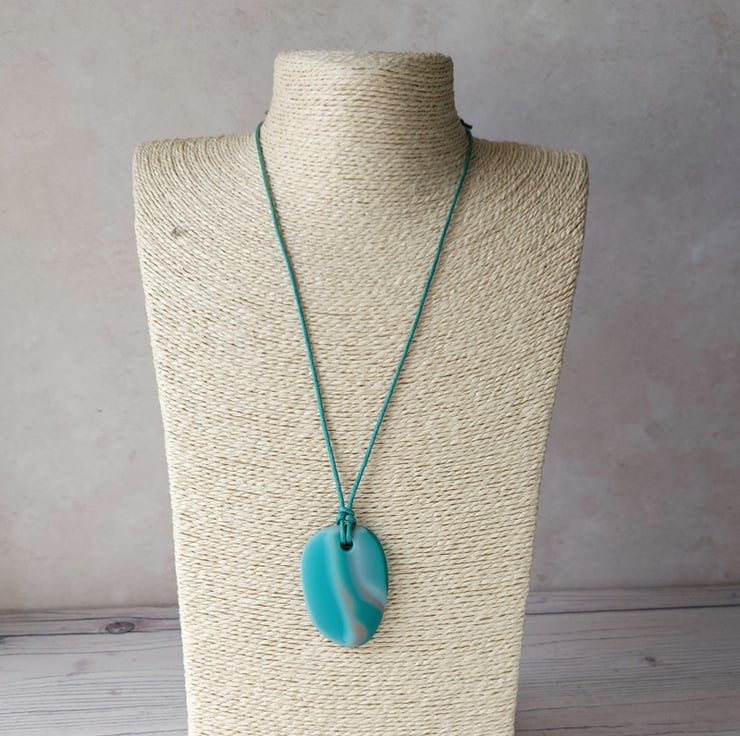 The large pebble shaped pendant has a hole drilled through it and hangs from an long teal coloured waxed cotton cord, soft and comfortable to wear. Two sliding knots fasten the cord and enable the length to be adjusted to fit.