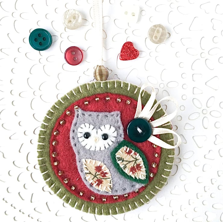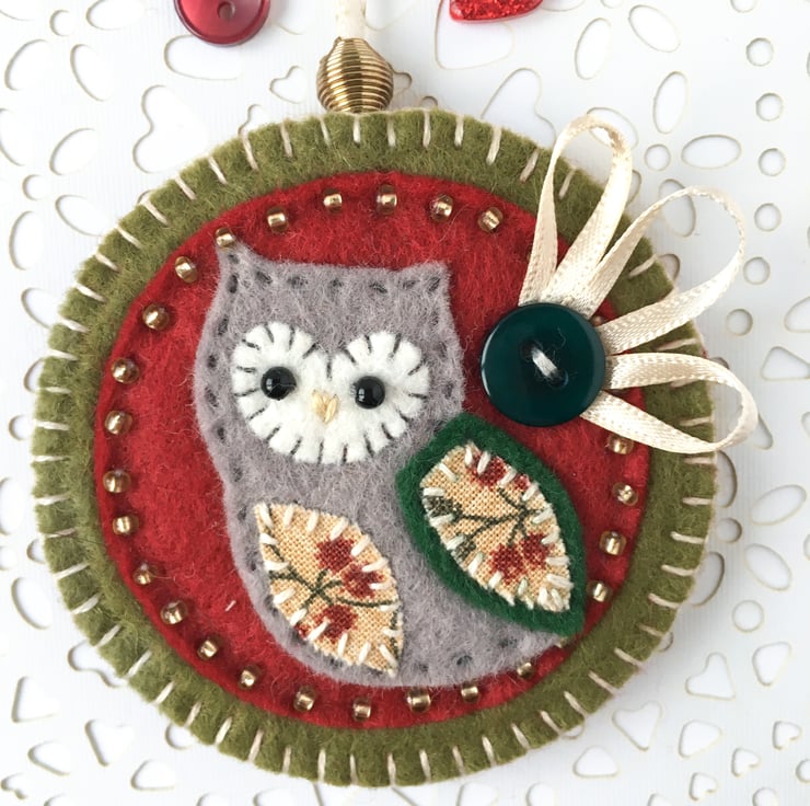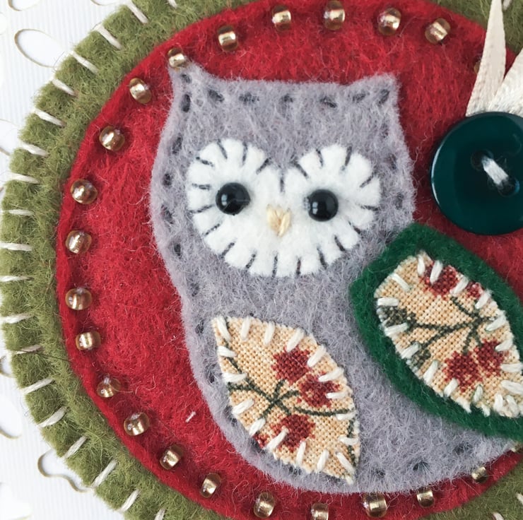 The felt owl has hand stitched applique details and is mounted onto a circular deep red felt base. It is further mounted onto a grey felt backing and is finished with gold seed beading and a pretty ribbon and button detail.