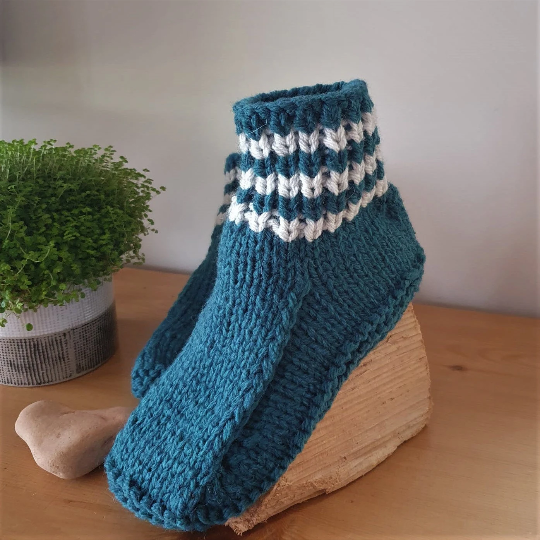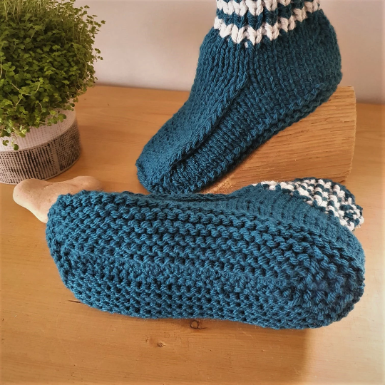 Hand knitted using two balls of Aran weight yarn at the same time, making these slippers, extra thick and cosy. The soles are knitted in garter stitch which gives a comfortable thick cushion to walk on.