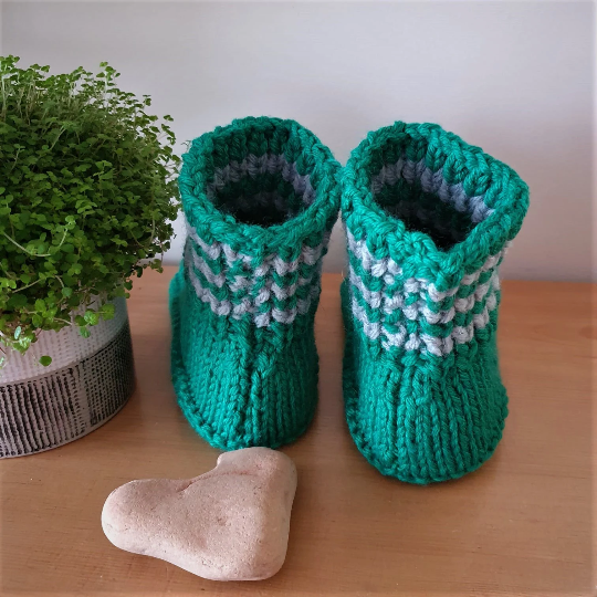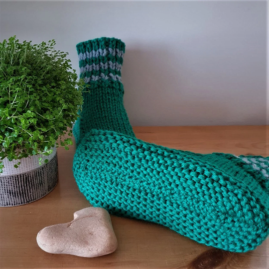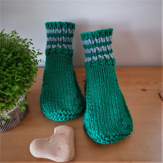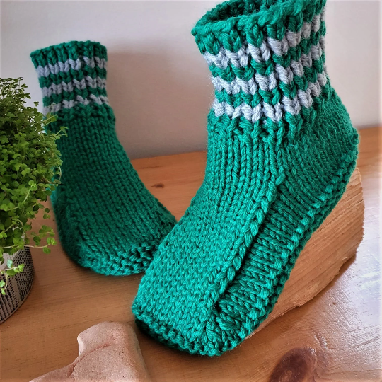 Knitted using two balls of wool together make the slippers extra warm and cosy. The sole is knitted in Garter stitch which makes the sole thick and comfy. Please note that these soles are not as robust as hard soled slippers.