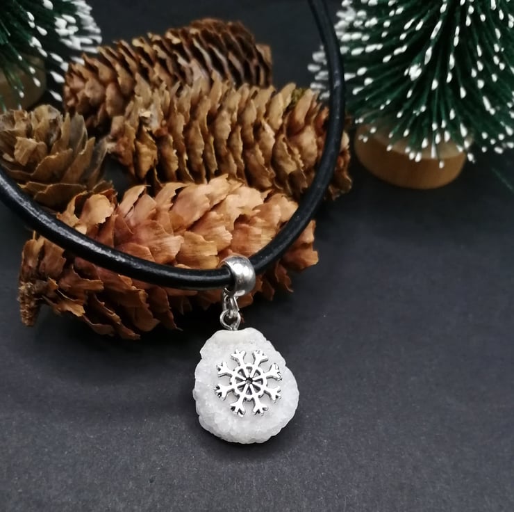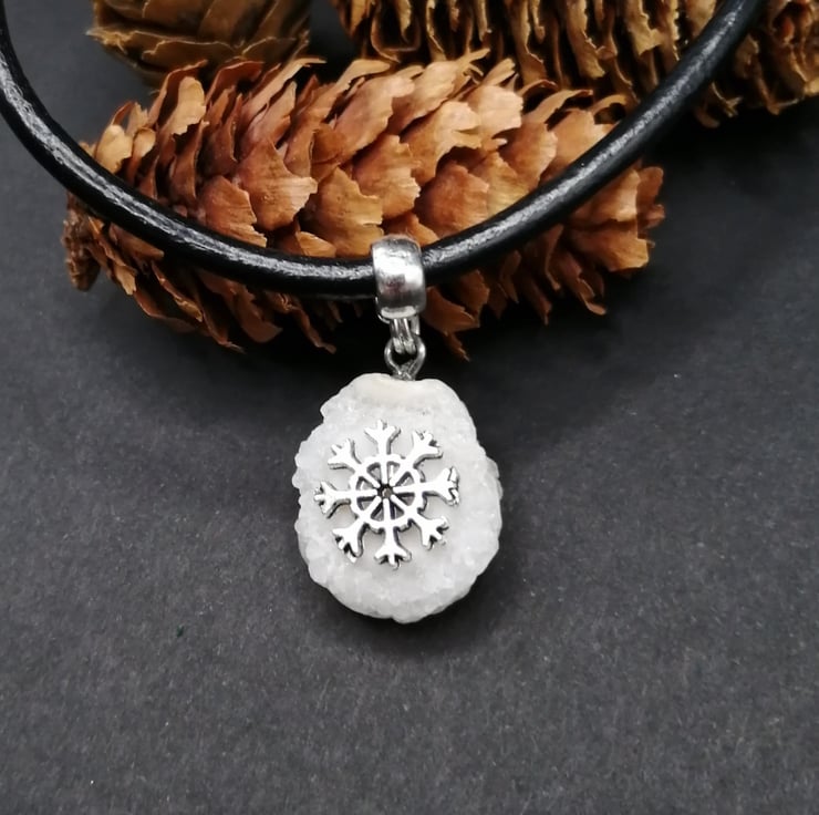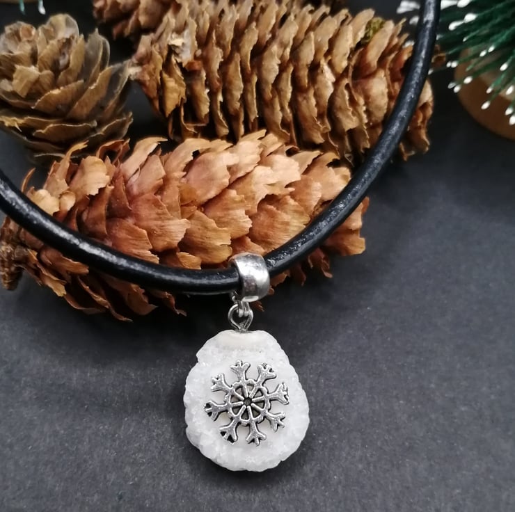 This teeny, tiny snowflake necklace is made from a slice of quartz. Please leave me a message with your choice of necklace and length. I am able to offer black or brown leather or silver plated chain in any length. If I do not receive a message I will send a 18 inch black leather necklace.