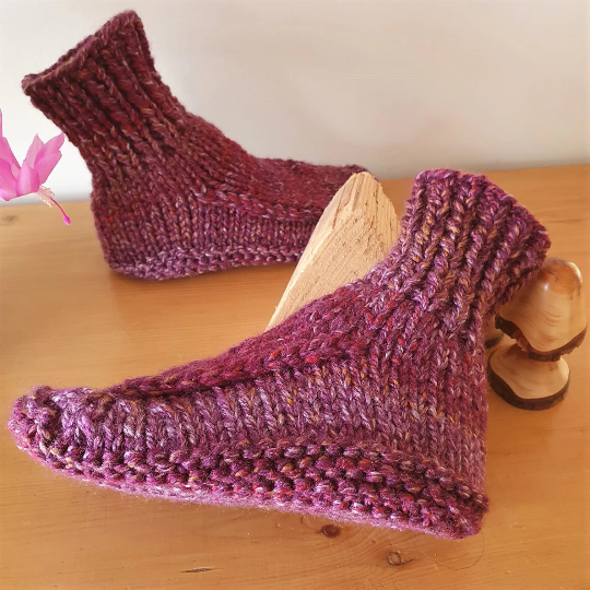 Vegan, Hand Knitted, Chunky, Adult Unisex Slippers Sizes UK 7 - 8, 8 - 9, 9 - 10, Dorm Boots, Bed Socks, Rich Purple Tones, Tweed Effect Yarn, Super Cosy.