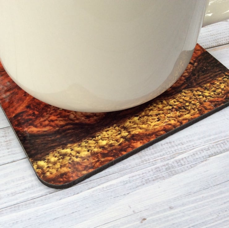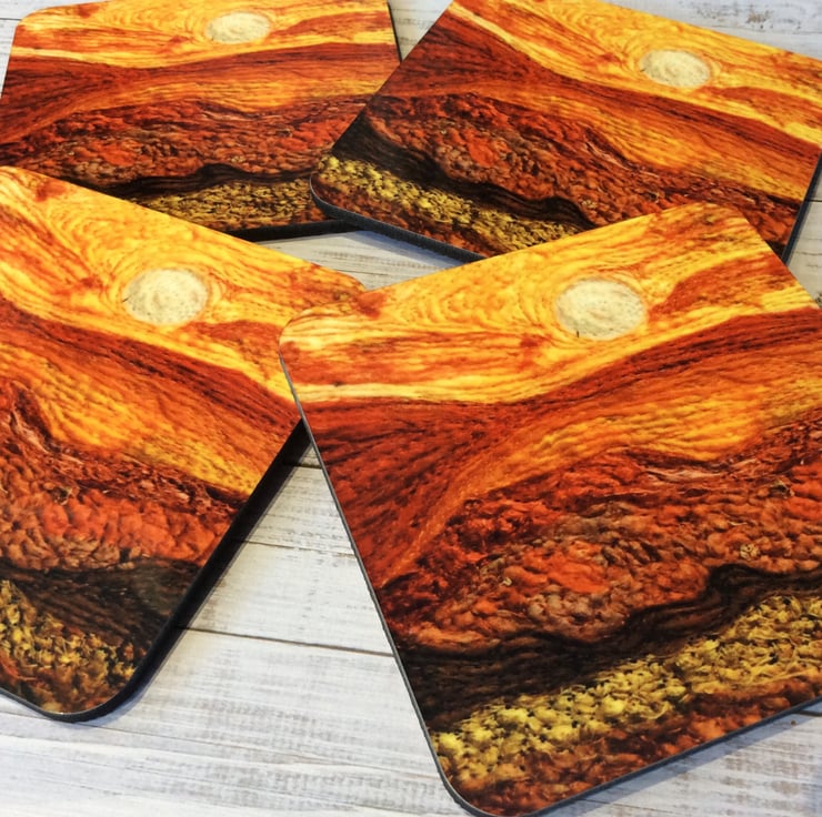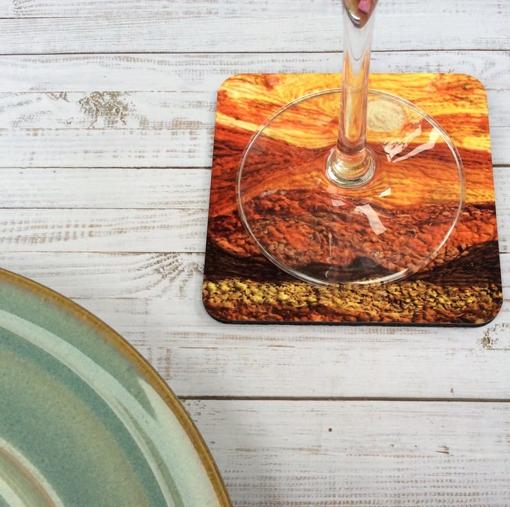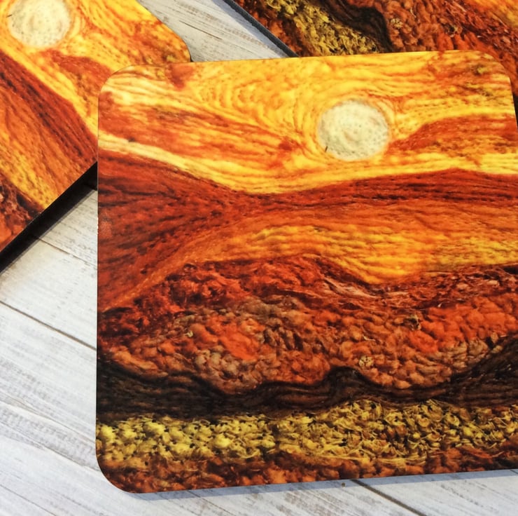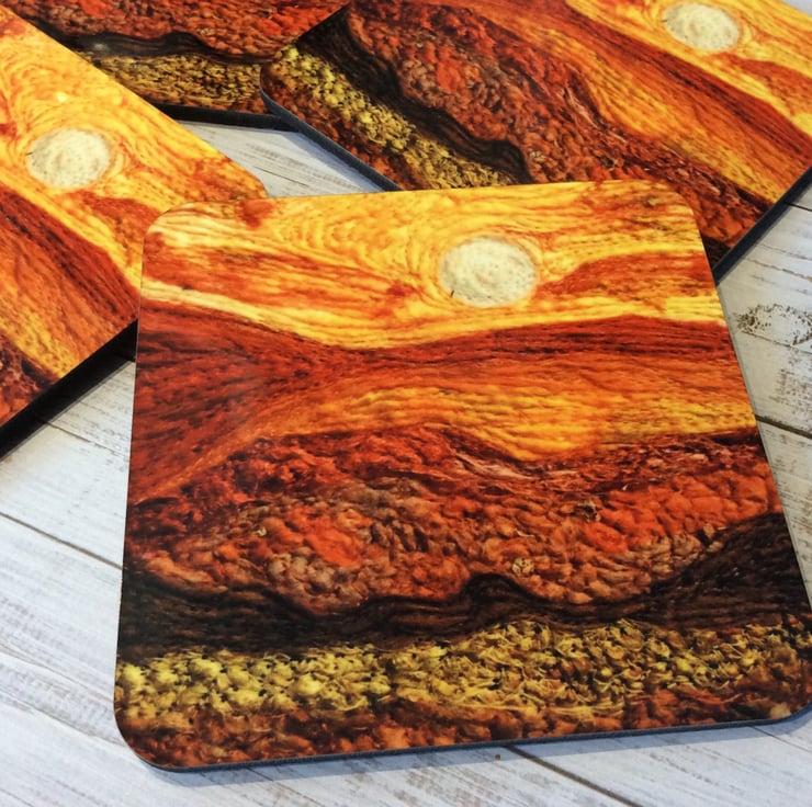 This coaster shows a print of one of my free motion embroidered sunset landscapes of Yorkshire. It’s one of 7 designs that would enhance any table setting, or just sit under your favourite mug.