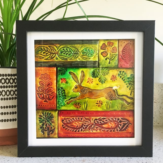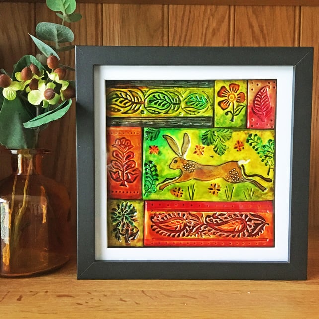 This small artwork is made from polymer clay tiles which I've shaped by hand and debossed with a range of patterns. They've been painted with glass paints in shades of green, red and orange.