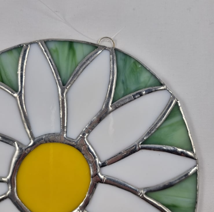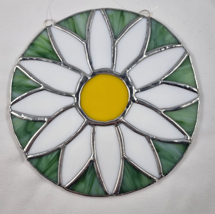 The flower circle is mad using white, yellow and green glass and has a ring with invisible thread for hanging it.