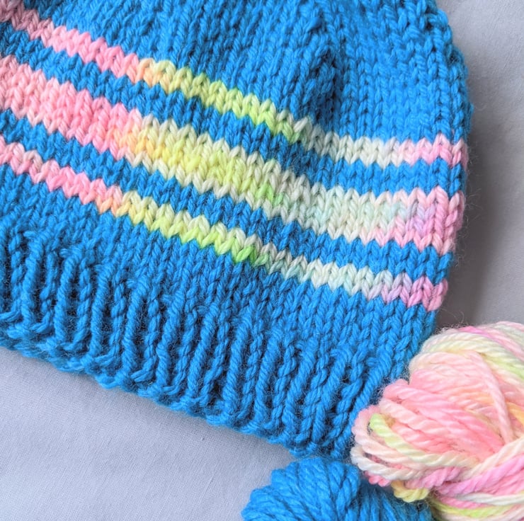 Perfect for winter walks, this child's hat is hand knitted using teal coloured wool with pastel coloured stripes.