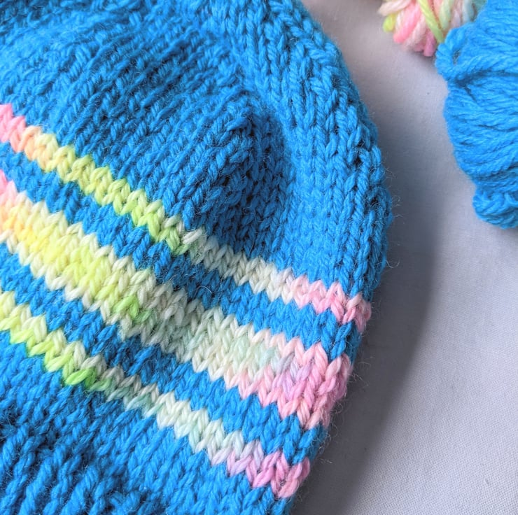 The stripes are created using hand dyed wool and the colours change between pastel pink, yellow, lilac and blue.