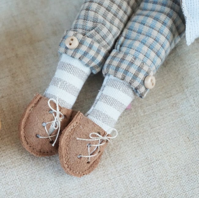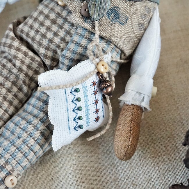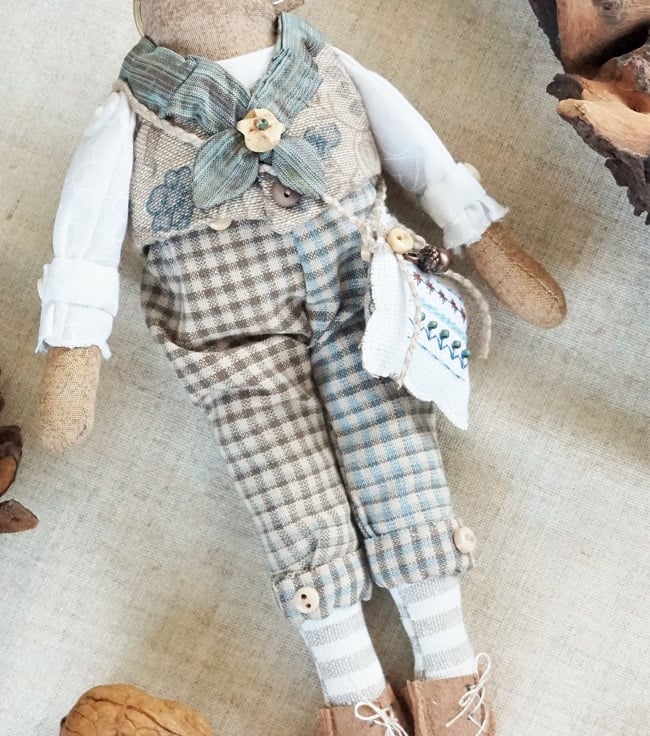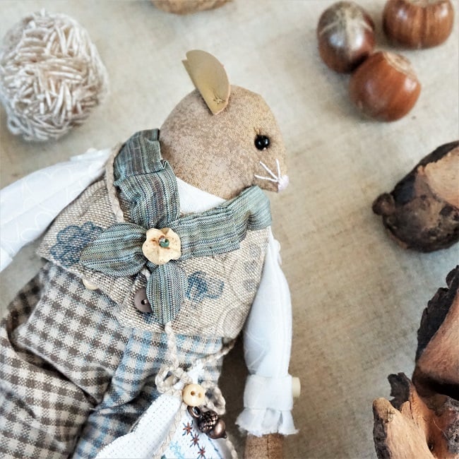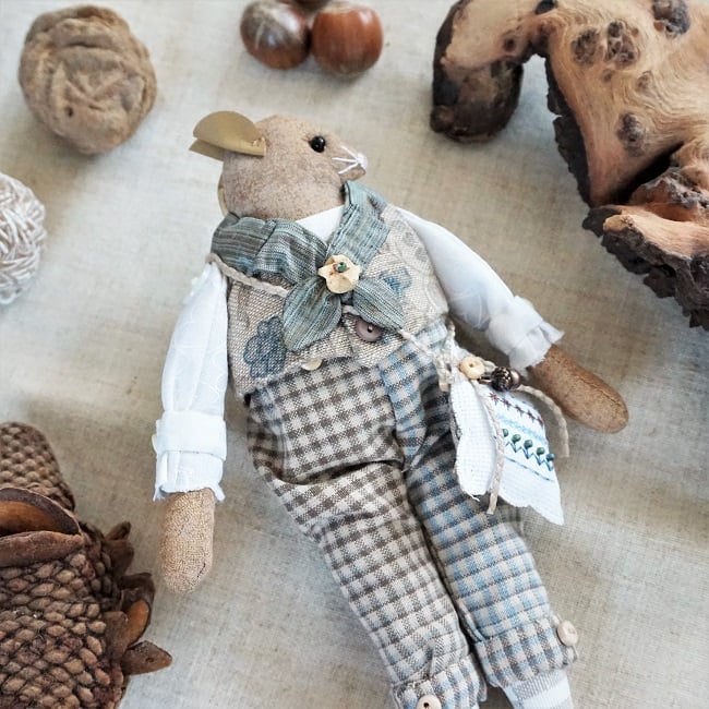 This is Hamo a tiny harvest mouse. He is a hand embroidered mouse with little leather ears and tail. He is dressed in tweedy cotton plus fours with cotton shirt and French linen waistcoat. He is finished with tiny buttons, leather shoes and a sampler on his little bag.
