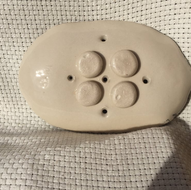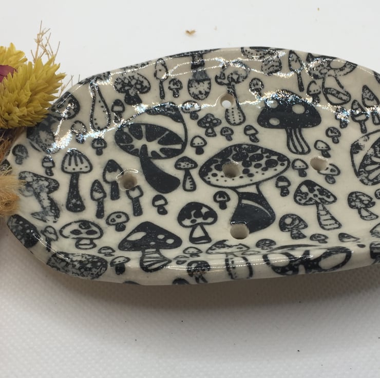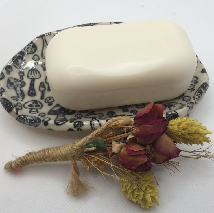 Stoneware soap dish measuring 5Ins (12cms) by 4 ins (10cms). Perfect for keeping your soap tidy on your sink. Decorated with mushroom decals.