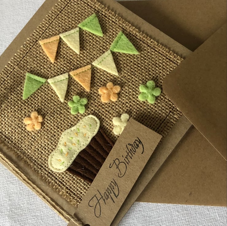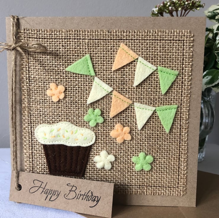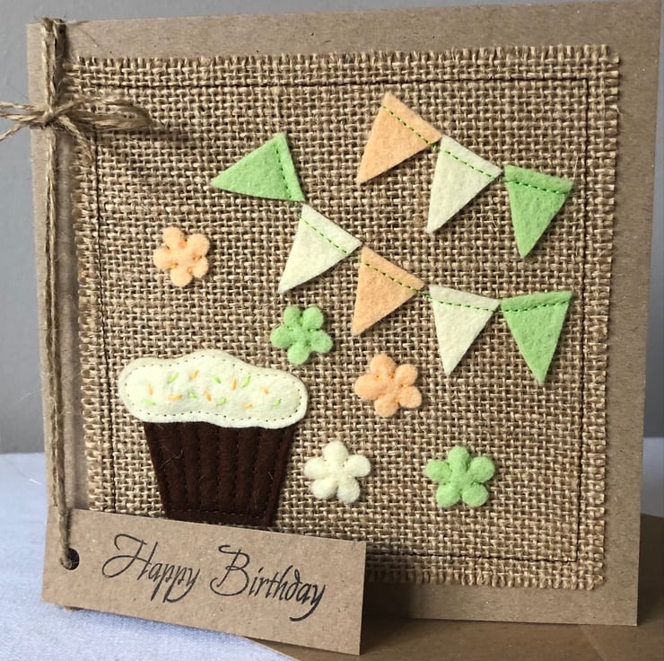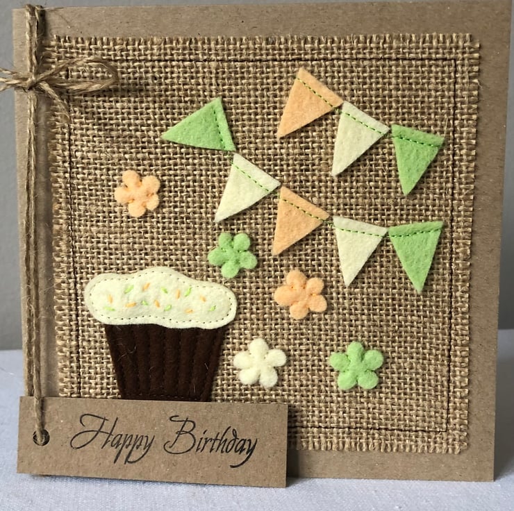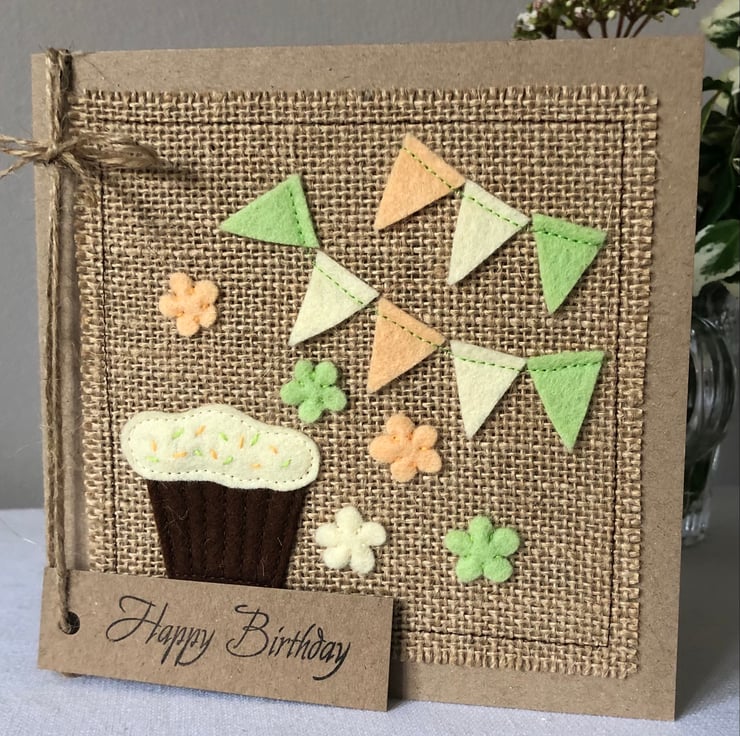 This card is decorated with a chocolate cupcake with mint green and pale orange bunting and flowers. Hand cut from 100% wool felt and hand and machine sewn onto a hessian background.