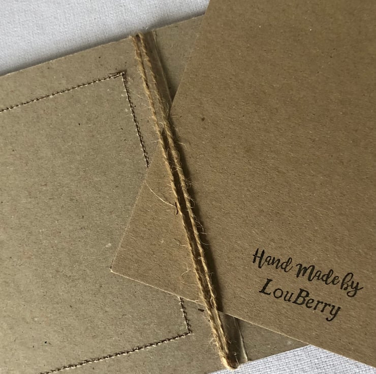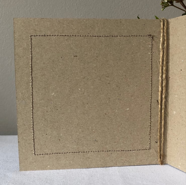 The hessian is machine stitched using a contrasting thread, onto a plain brown recycled card. This stitching is visible on the inside of the card.