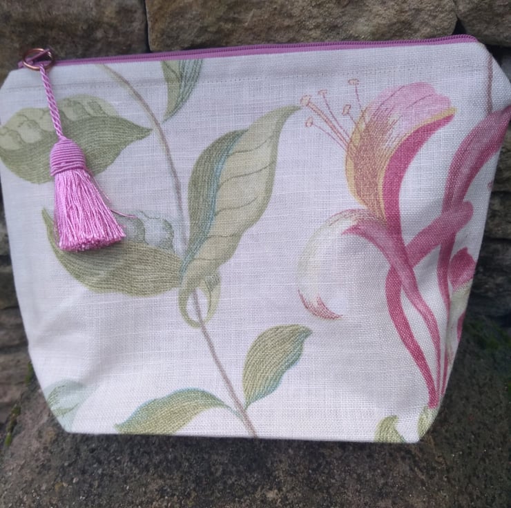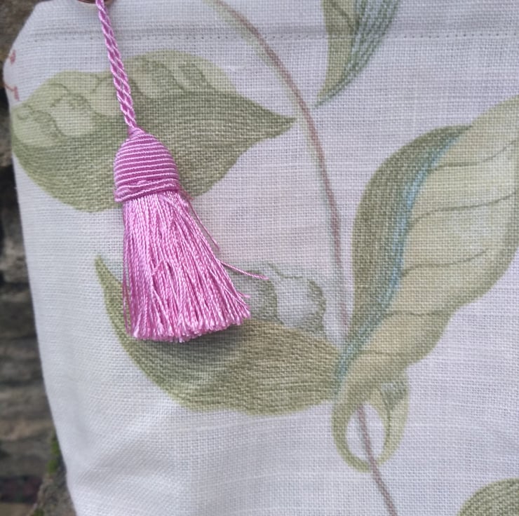 The Bag is finished with a pink mini tassel by VV Rouleaux attached as a pull to the mid-pink zip. It measures approximately 25 cm wide by 19 cm high and has a gusseted bottom.