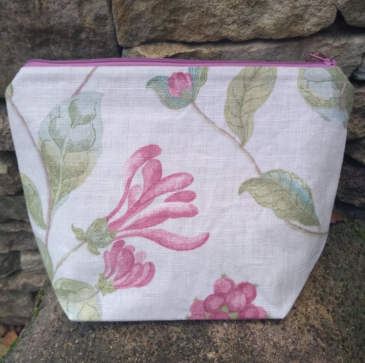 Outer Fabric is 100% linen 'Lonicera' by the designer Nina Campbell featuring pink honeysuckle blooms and pale green leaves on a cream background;