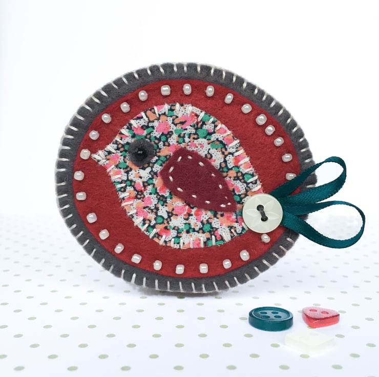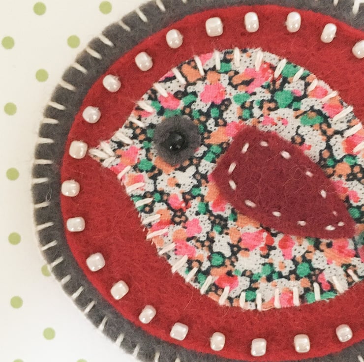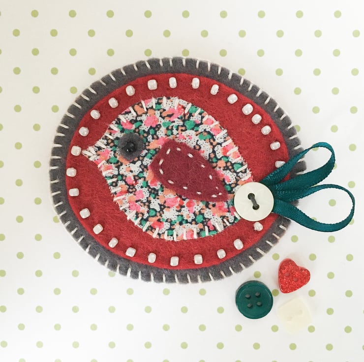 The fabric bird is in lovely Liberty of London fabric. It has been stitched onto maroon felt which has been edged with cream seed beads. It has been further mounted onto charcoal grey felt and finished with a pretty ribbon tail with button detail.