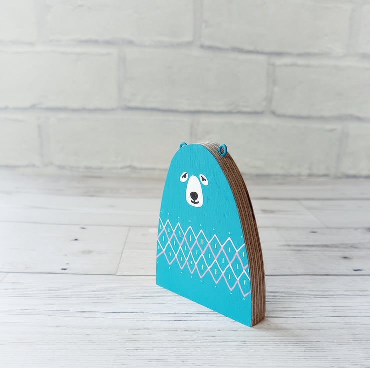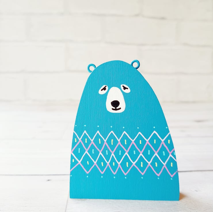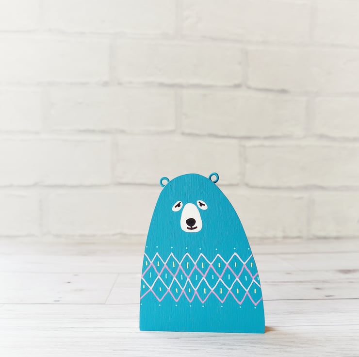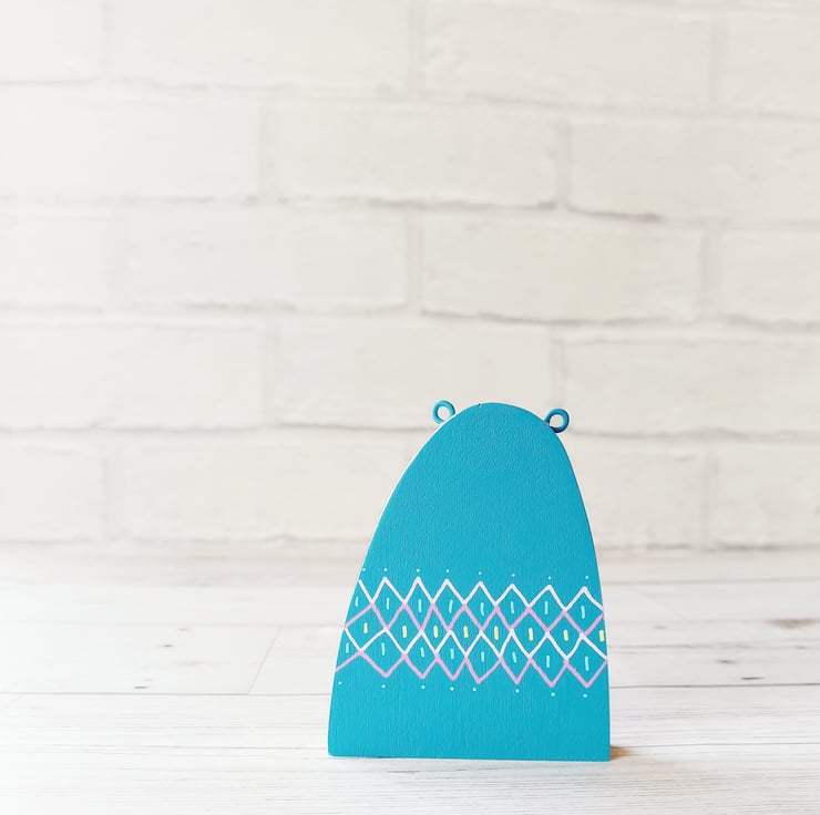 This folky little wooden bear has been cut from 9mm plywood, painted teal and decorated with turquoise, yellow and pink on both sides.