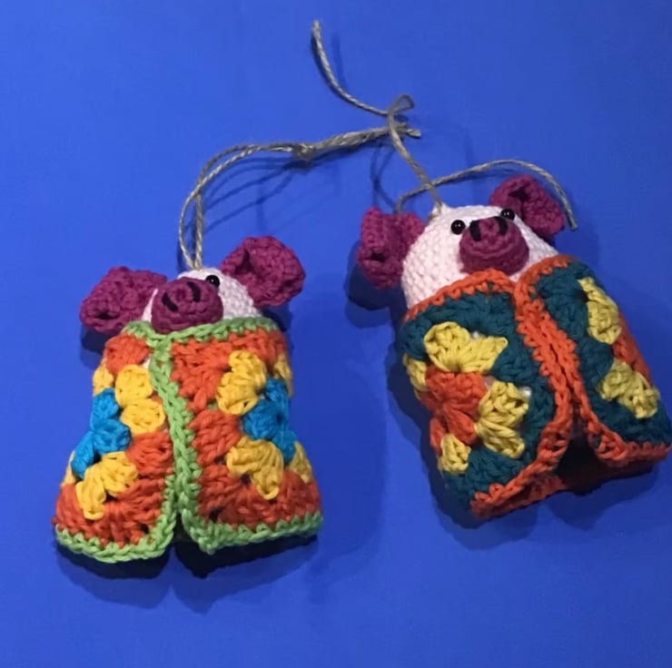 Here we have a cute amigurumi pig wrapped in a granny square blanket. He is made from cotton yarn and has black safety eyes, along with a jute cord for hanging up. He measures approximately 12cm tall.