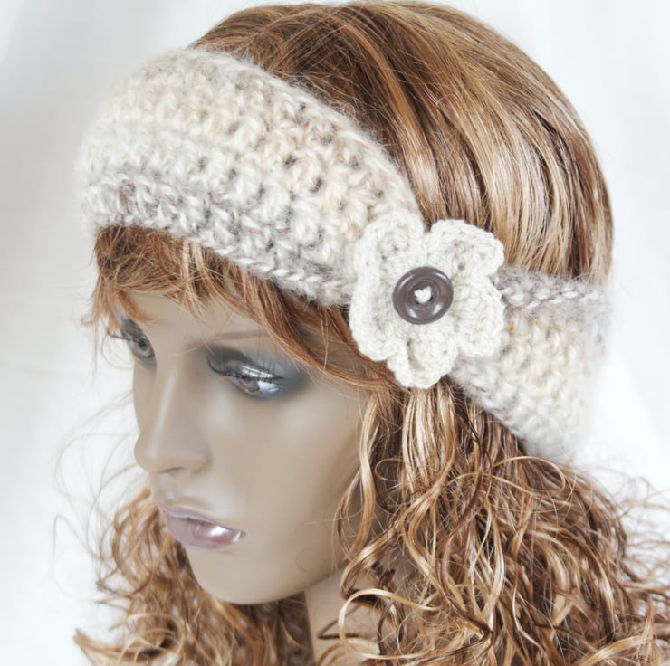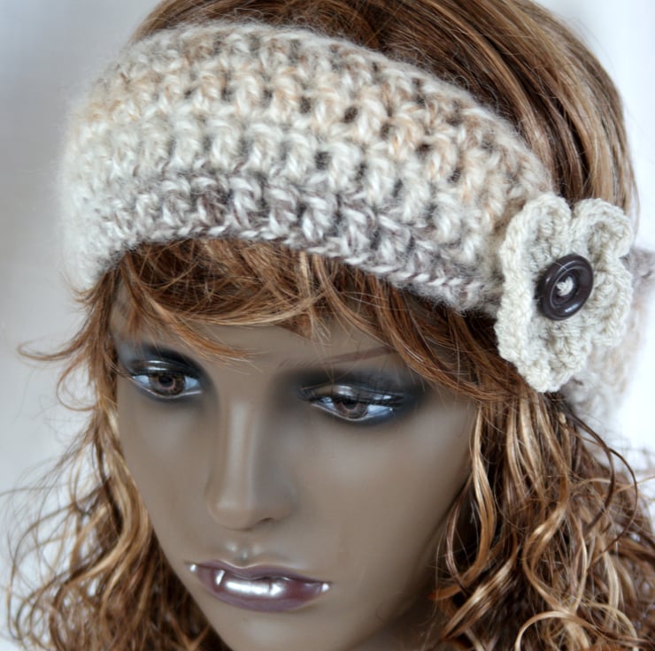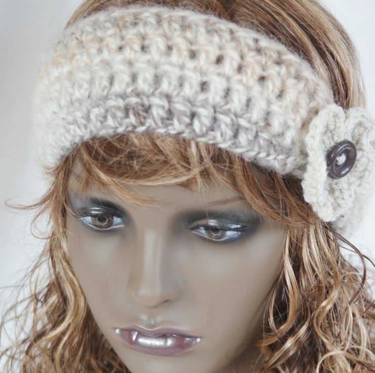 Chunky crochet headband with flower. made with 25% wool fibres. Brushed yarn in varigated shades of cream and browns. Finished with a lighjt beige crochet flower with a button centre