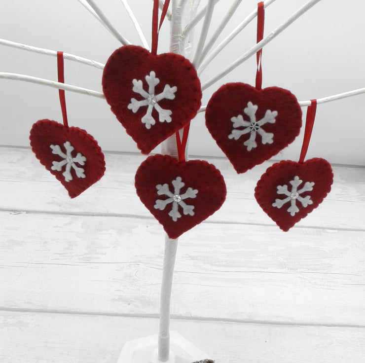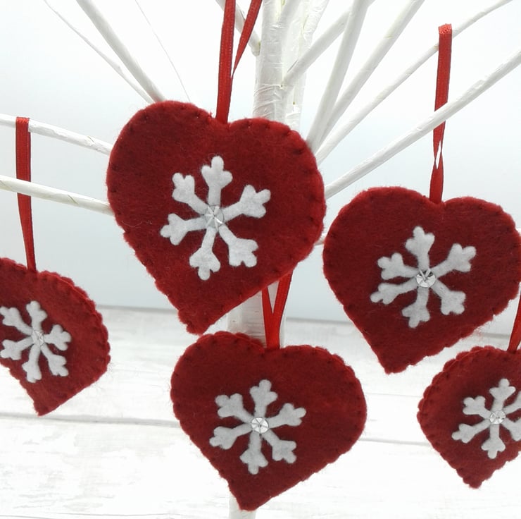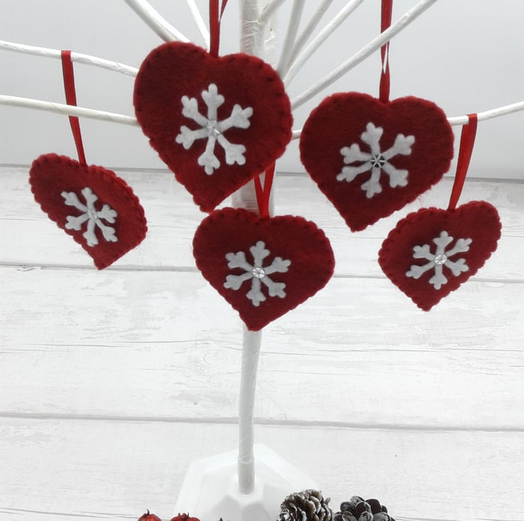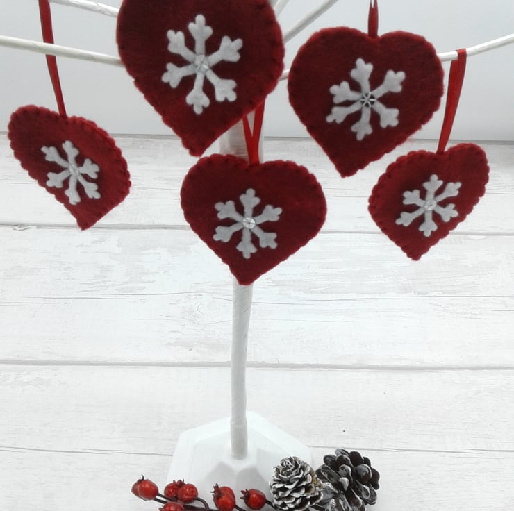This is a lovely set of 5 felt heart decorations with snowflakes.