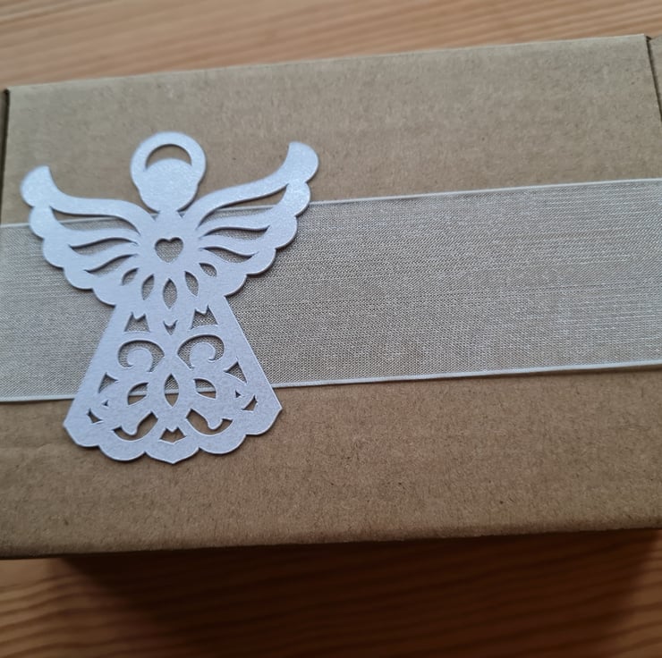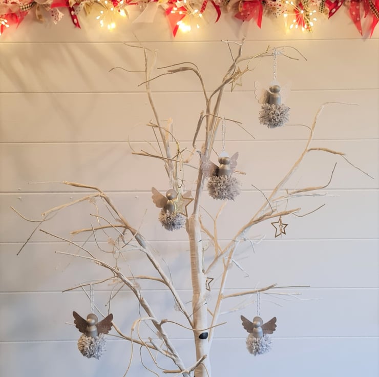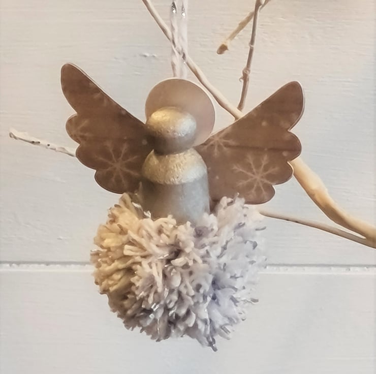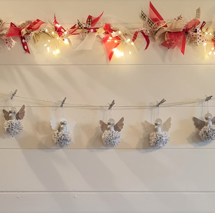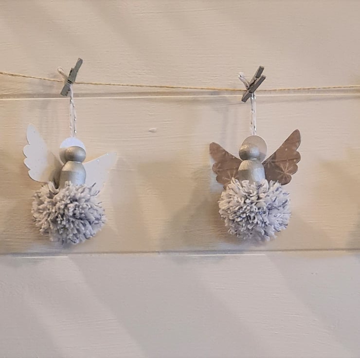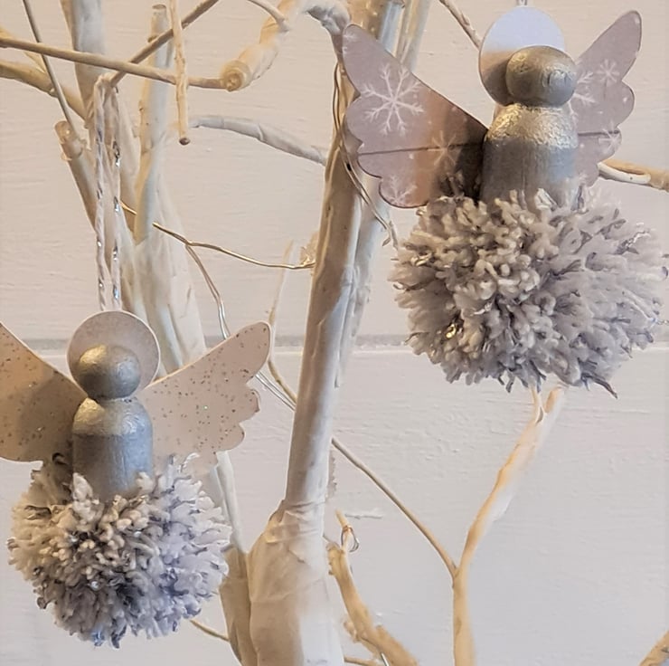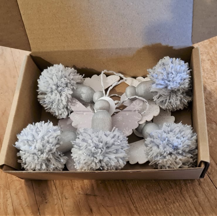 A set of 5 gorgeously flamboyant silver angels, complete with pom pom skirt. The pom pom is made with yarn that has metallic fibres and sequins woven in, to give them that lovely Christmas sparkle. The angels can be hung on a tree or used with the string and pegs provided to create a hanging garland. Each angel is approx 2.5 inches/6.5 cm tall (not including the hanging loop)and is the same across the wing span. They are presented in a brown kraft card box, perfect for keeping them safe in between Christmas appearances.