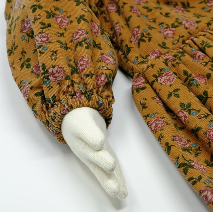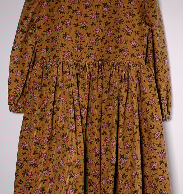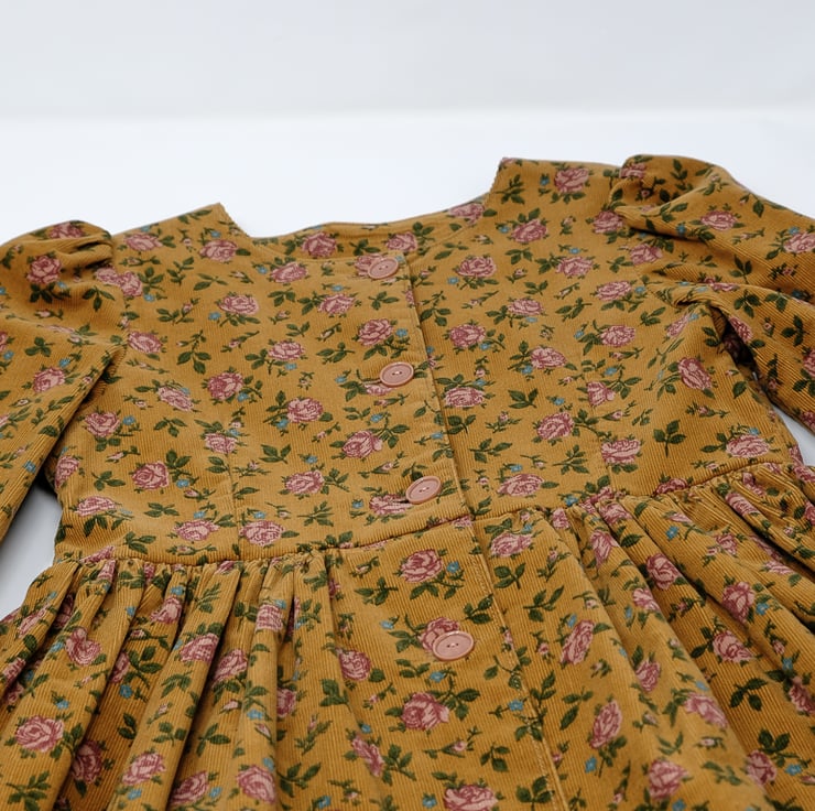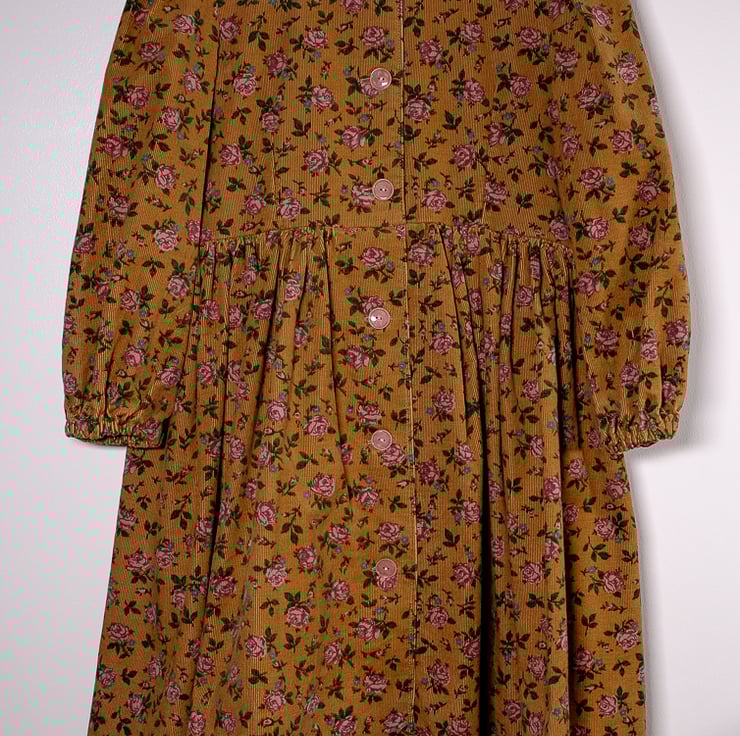 Coffee coloured floral dress in super-soft baby corduroy. Long, gathered sleeves with elasticated cuffs. Front-button fastening and lined bodice with front darts for a lovely fit.