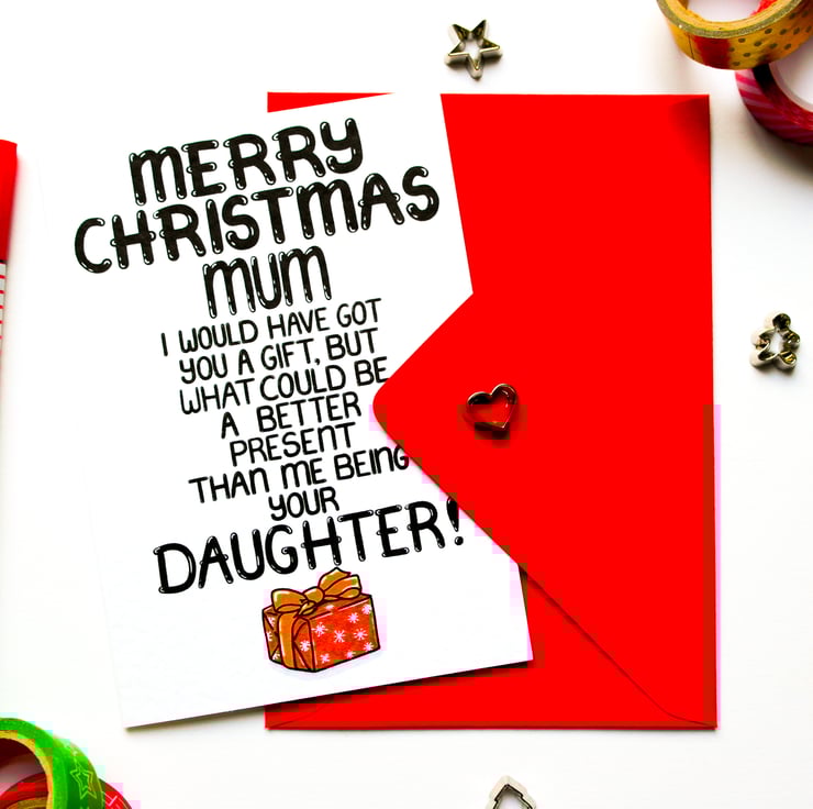 Greeting on front: MERRY CHRISTMAS MUM I WOULD HAVE GOT YOU A GIFT, BUT WHAT COULD BE A BETTER PRESENT THAN ME BEING YOUR DAUGHTER!