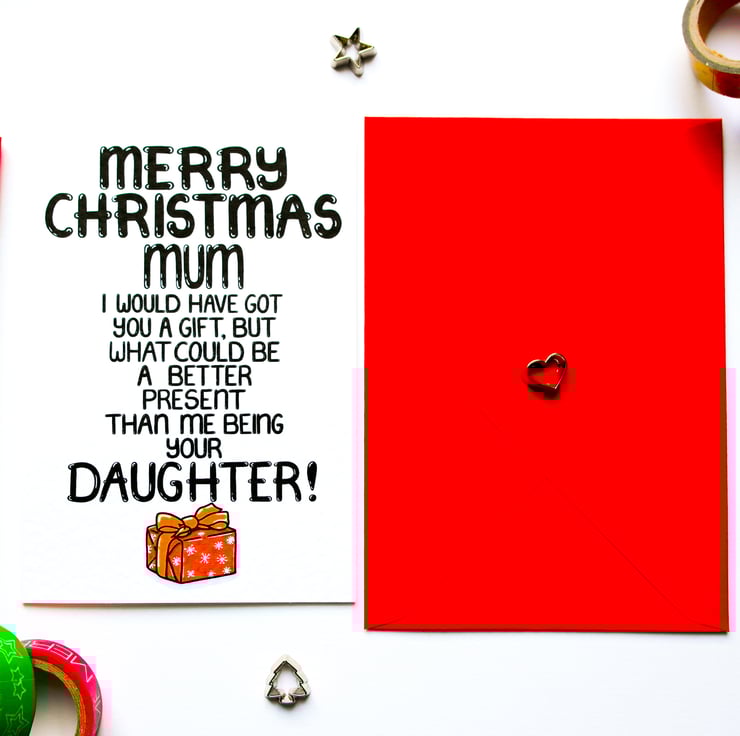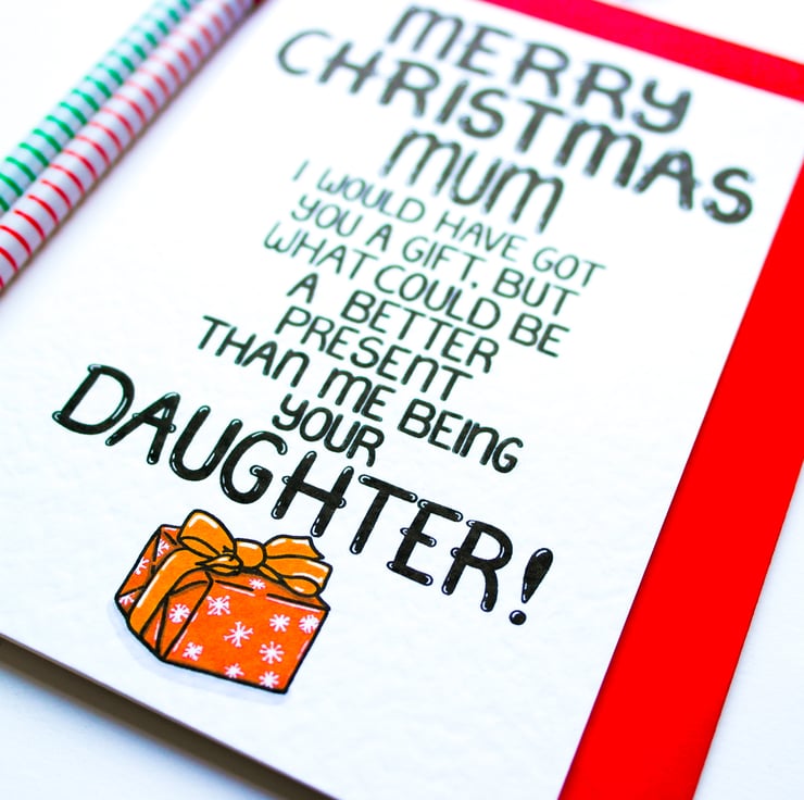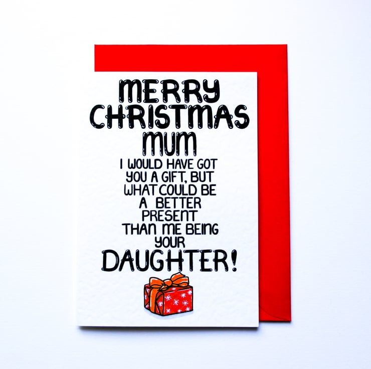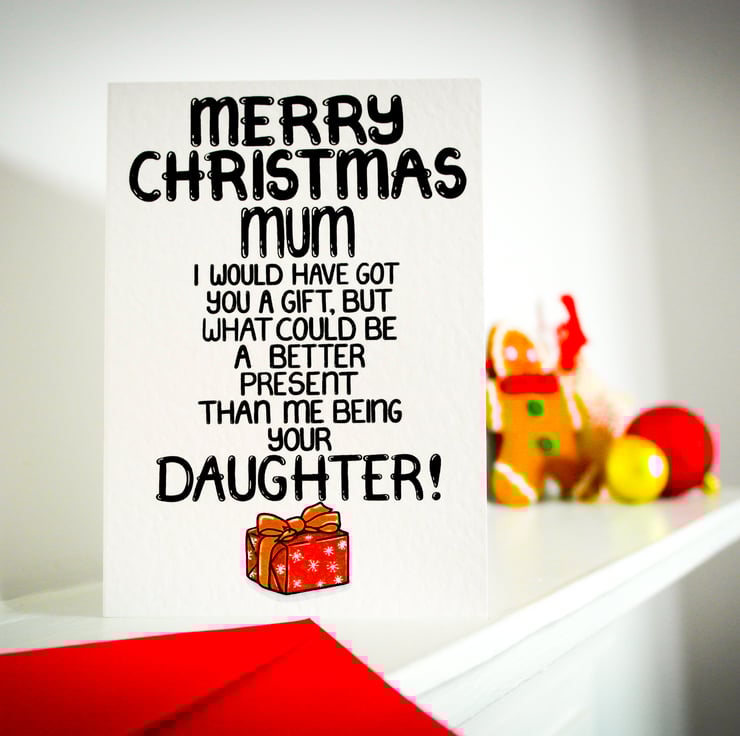 Greeting on front: MERRY CHRISTMAS MUM I WOULD HAVE GOT YOU A GIFT, BUT WHAT COULD BE A BETTER PRESENT THAN ME BEING YOUR DAUGHTER!