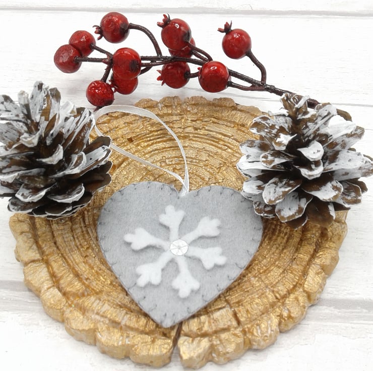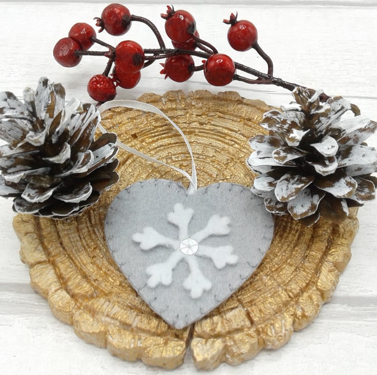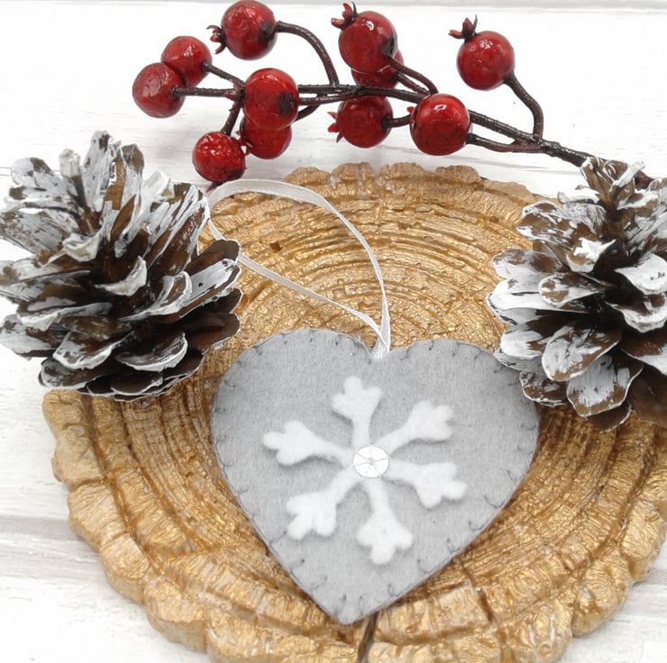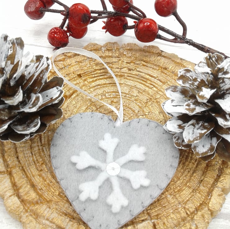 This is a set of 10 grey felt hearts with white snowflakes and silver sequins.