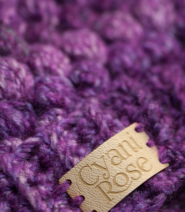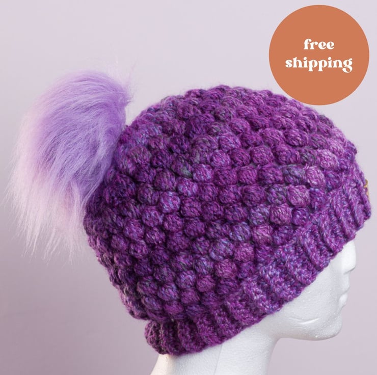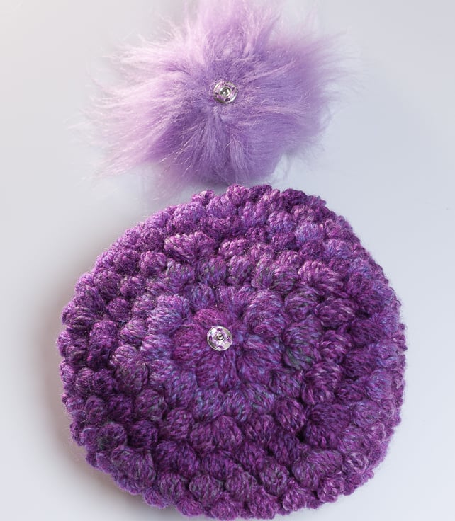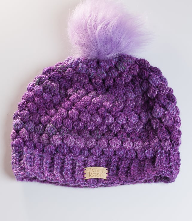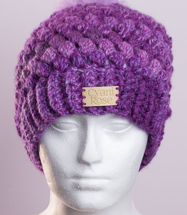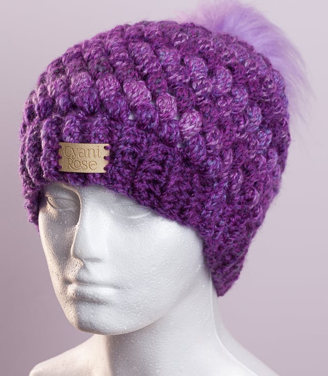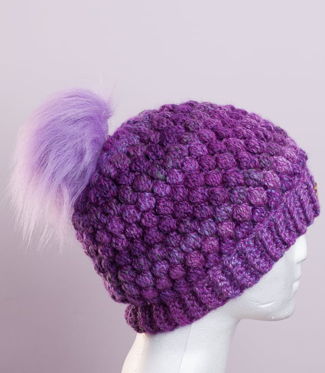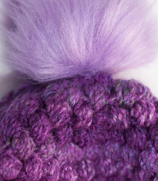 It is a lovely purple colour with a fluffy lilac pompom. I have also hand made the pompom from faux fur material. I decided to make my own after reading reports that some faux fur pompoms sold on the high street were shown to contain animal fur. By making them myself I can see the back of the fabric structure and you can tell it is not an animal product. It is stuffed with acrylic toy stuffing.