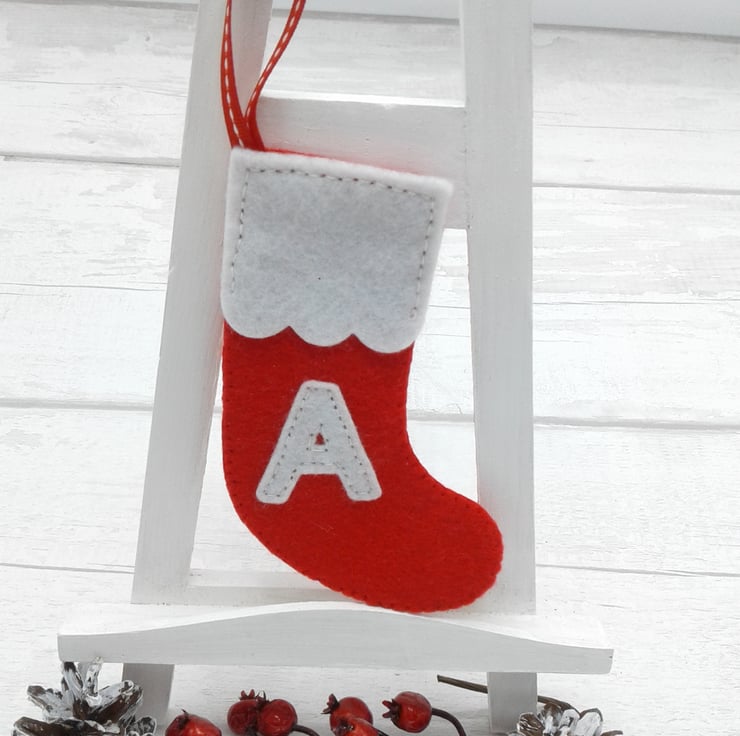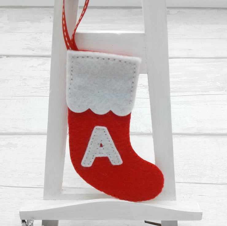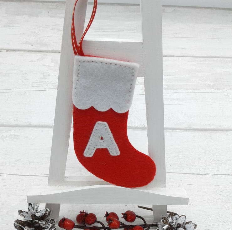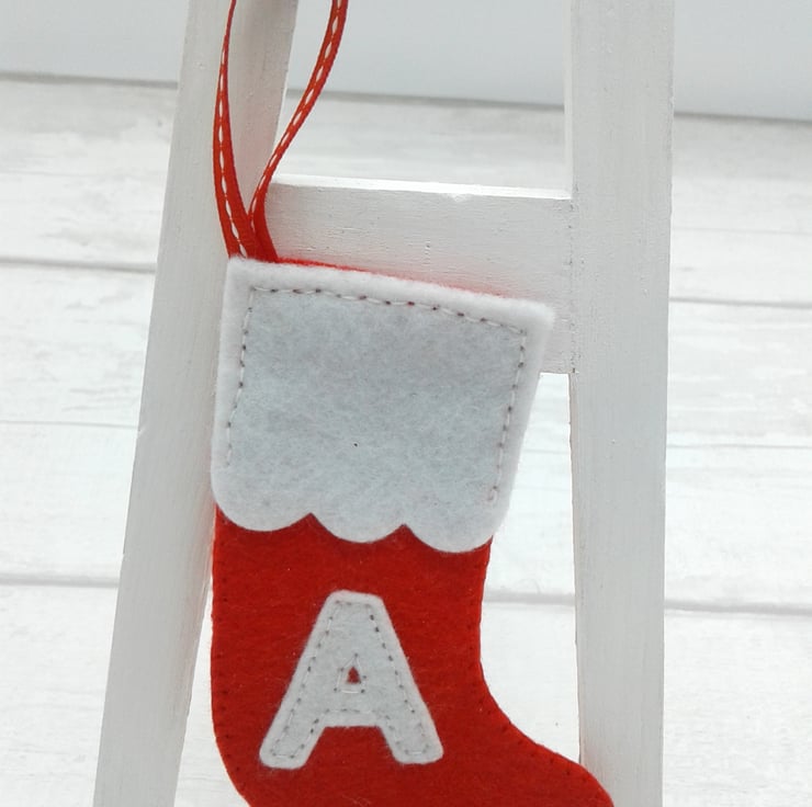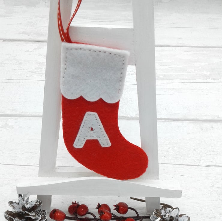 This is a personalised felt stocking designed to be hung on the Christmas tree. This item could also be used as a place setting which Christmas guests could then take home and hang on their Christmas trees.