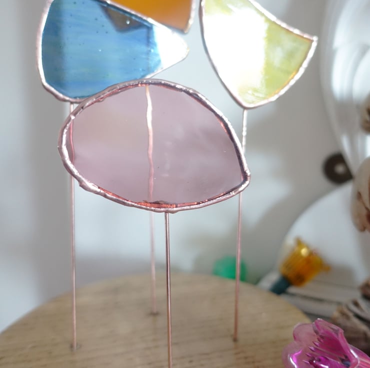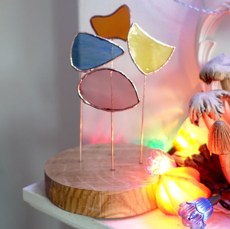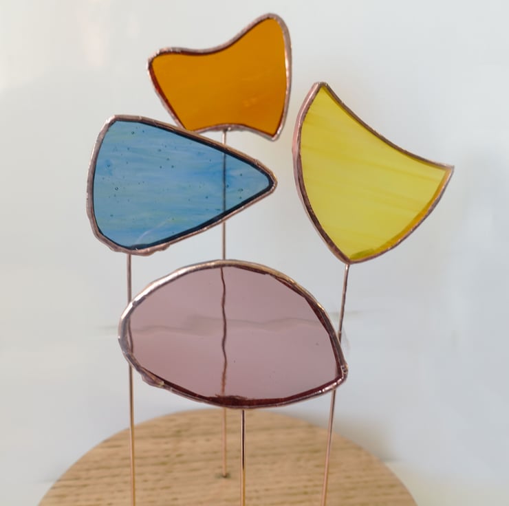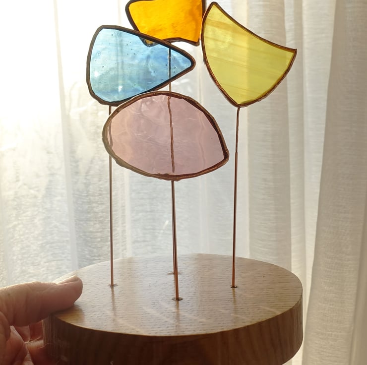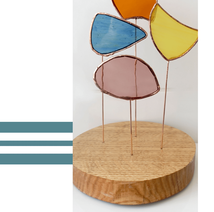 Four retro style 1950s inspired shapes in vintage colours made from stained glass and mounted on copper rods. Slot each rod into the hole in the Ash wood base. No glue needed.