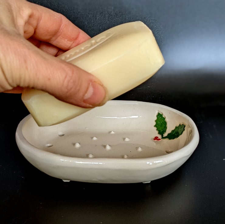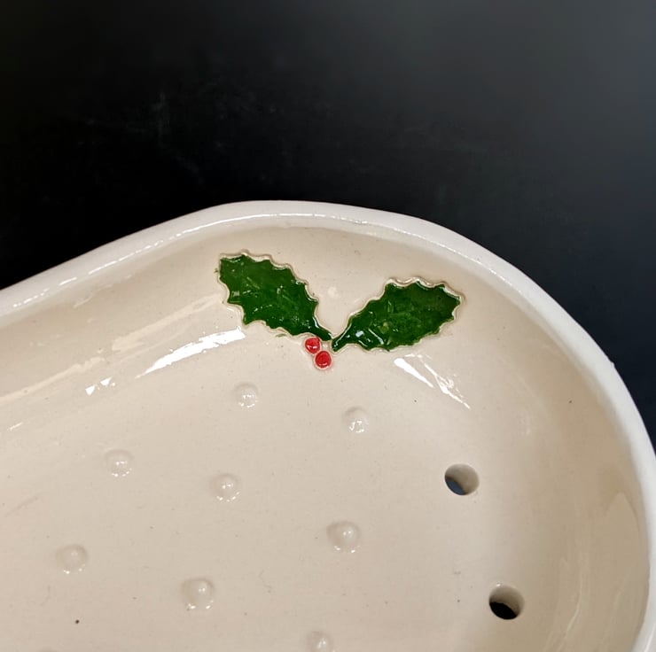 This simple creamy white coloured soap dish is decorated with two sprigs of holly. Each sprig of holly is made of two leaves and tiny balls of clay for berries. The leaves are cut out of a thin sheet of clay and placed on the mould, the whole mould is then covered with a sheet of clay, so that the the leaves and berries are slightly recessed into the clay, but are level with the surface of the dish. The holly is painted with a deep green and Christmas red underglaze, and the whole piece coated in transparent glaze. The beauty of this technique means that while the sprigs of holly are separate to the body of the dish there are no cracks or crevices for soap residue to get stuck in.