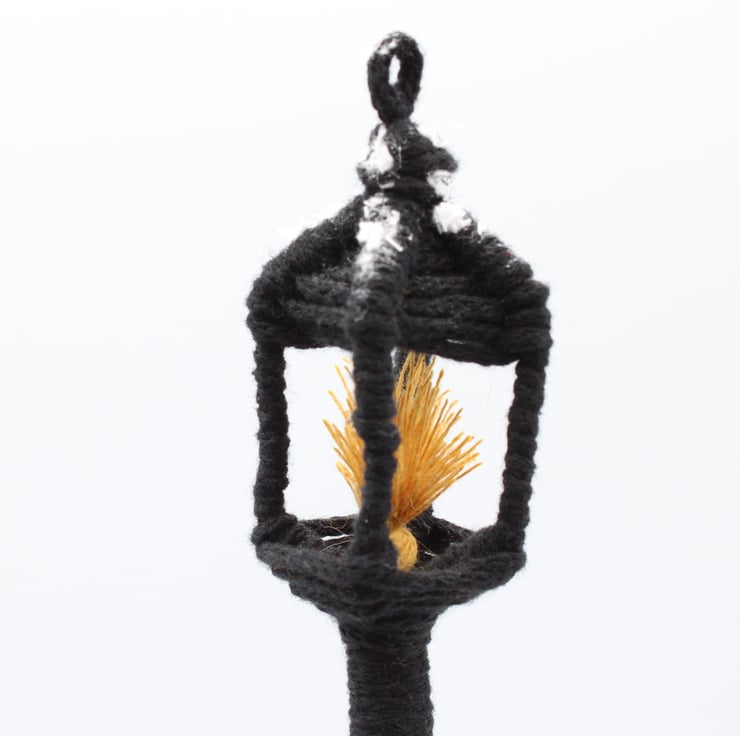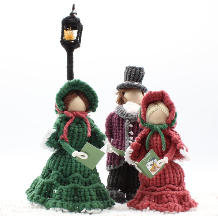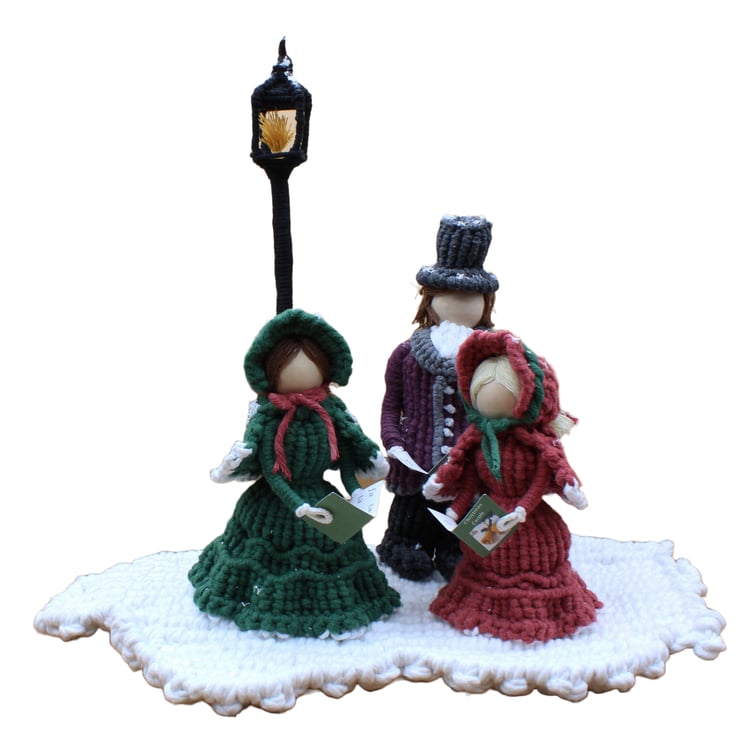 A trio of macrame Victorian carol singers standing under the gas lamp in the snow. A light dusting covering the lamppost and settling on them as sing. The two female singers are wearing traditional Christmas coloured dresses, with matching bonnets and capes. A slip of white petticoat can be seen beneath the dresses. The gentleman is wearing a purple coat with a light grey collar and a white cravat. His trousers are two tone grey and black, whilst his hat and shoes are dark grey. These are macrame carol singers and they have been individually knotted by hand using 100% recycled cotton cord. The little carol song sheets are made from thick paper. The gas lamp is black with a warm yellow glow in the lamp. It has a piece of wire threaded through the middle for stability. The carollers are standing on a white bed of snow for which I used a thick twisted cord for effect. The male carol singer also has a piece of wire threaded from the bottom up through his trouser legs, again for stability. A piece of poplin cotton has been hand sewn to the base.