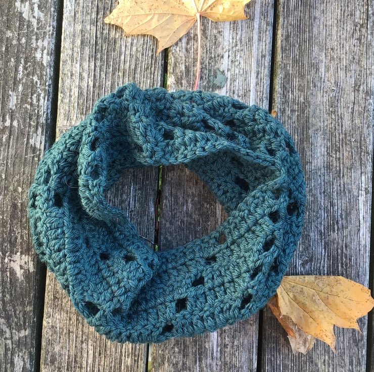 Lacy infinity scarves are crocheted in 4ply yarn.