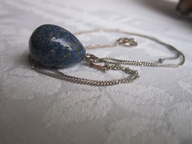 A teardrop shaped Lapis Lazuli pendant with a sterling silver bail and chain. The chain has a bolt clasp and it's length is approx. 18 inches in length. The pendant is fairly light weight and the chain is quite fine. This pendant will come in an organza bag.