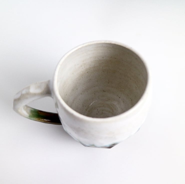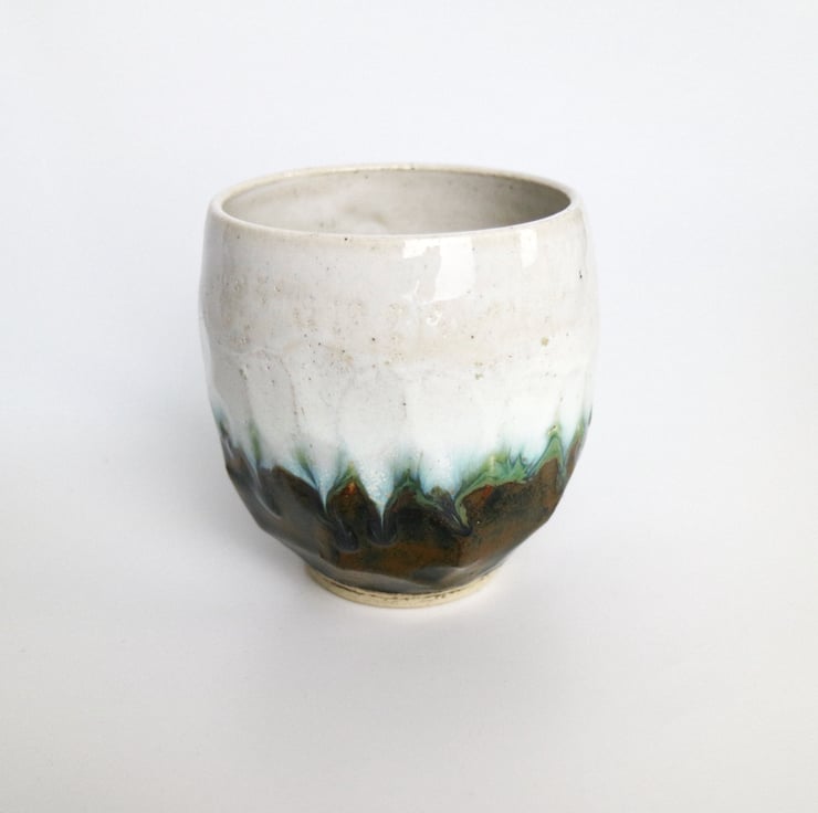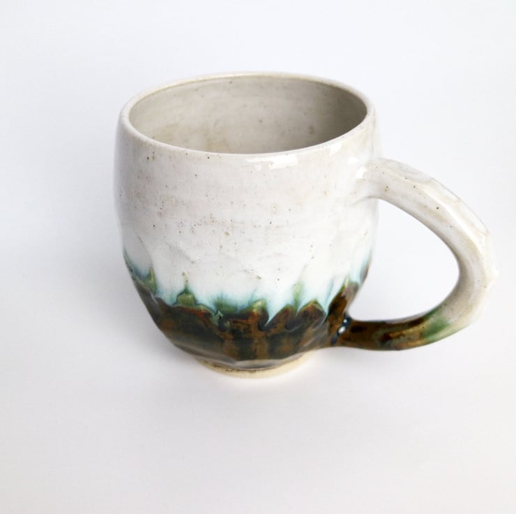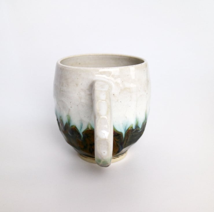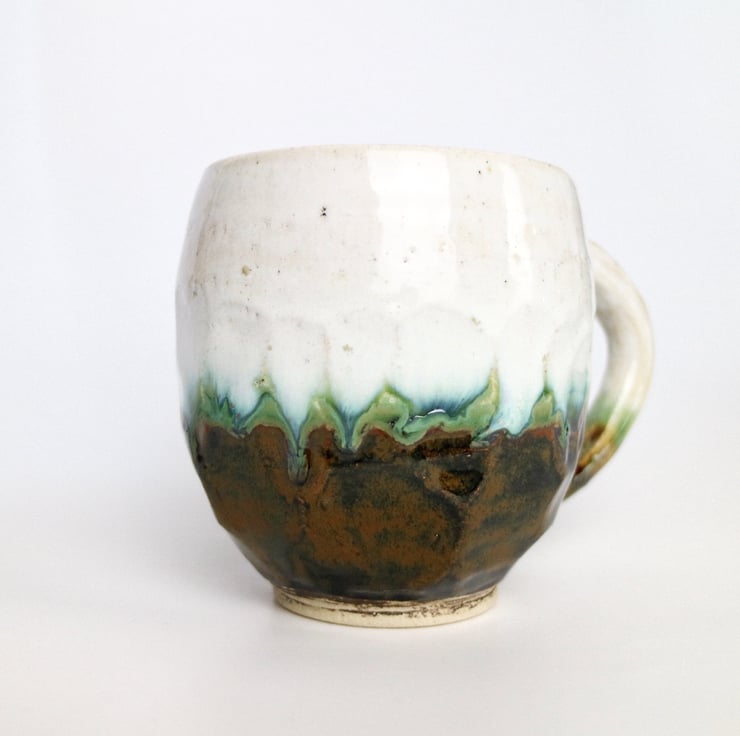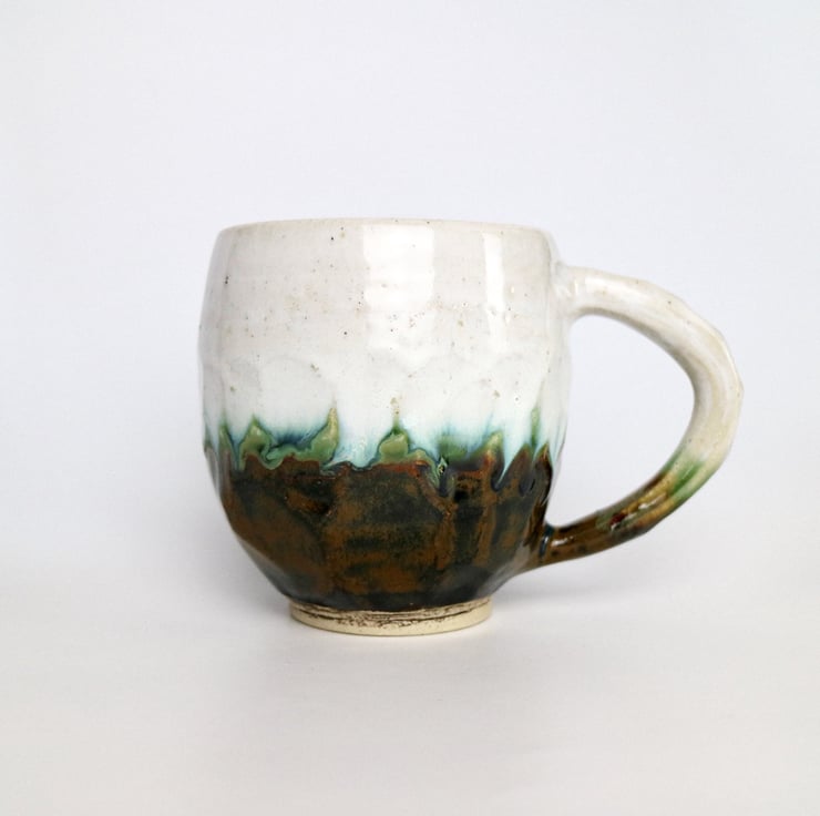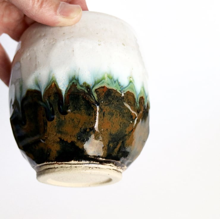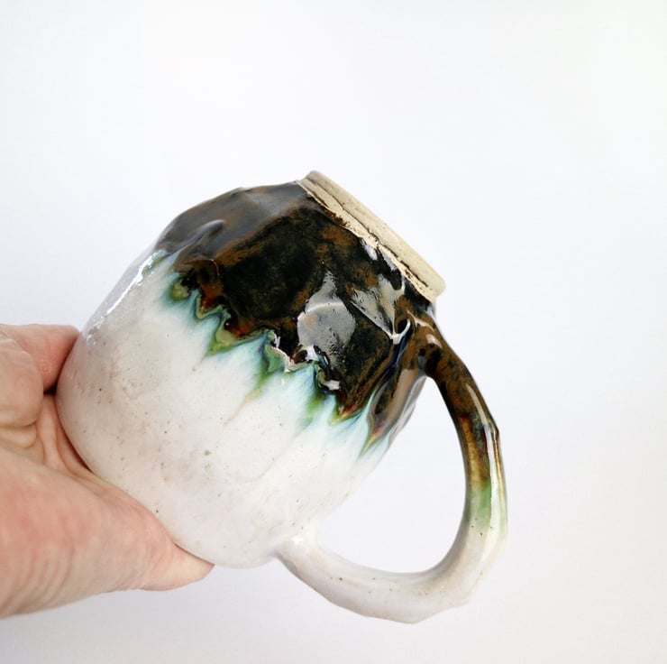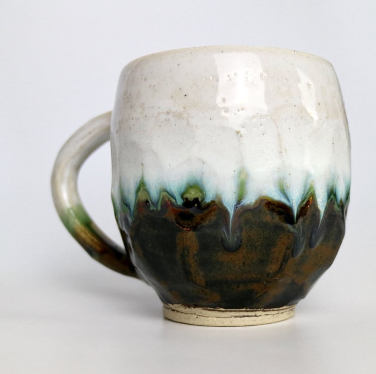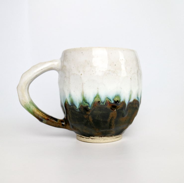 Glazed with a speckled cream blending into an opaque foamy white that breaks over the texture to reveal a splash of green, the base is a woody black/brown.