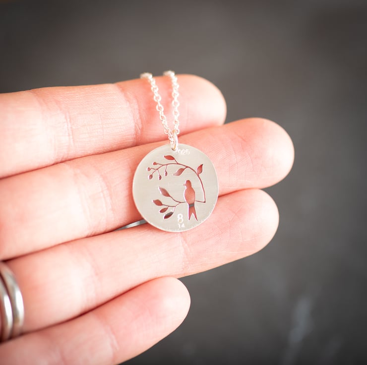 I have drawn the bird image, transferred it to a sheet of silver, and then used the traditional method of saw piercing to carefully saw out the design by hand.