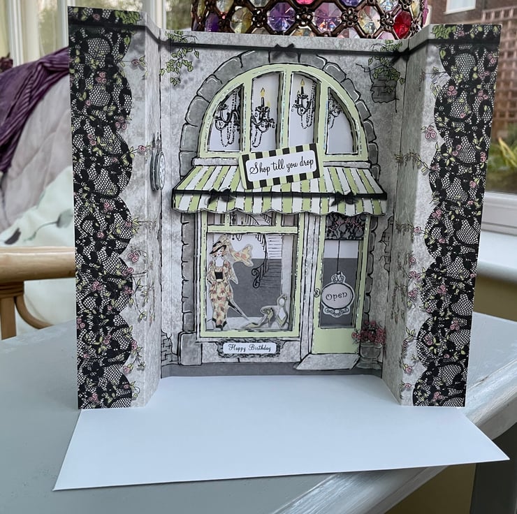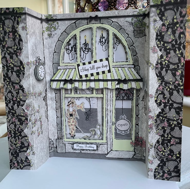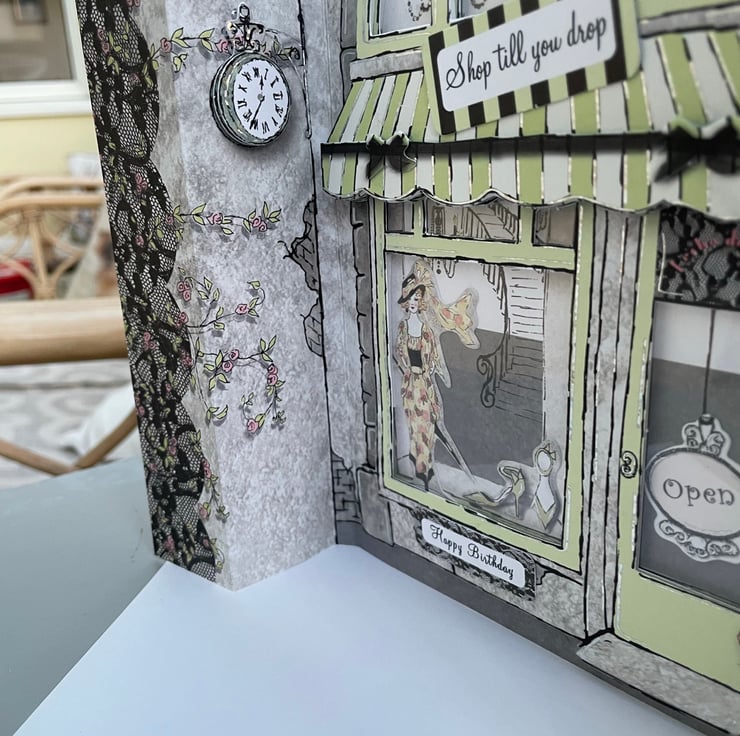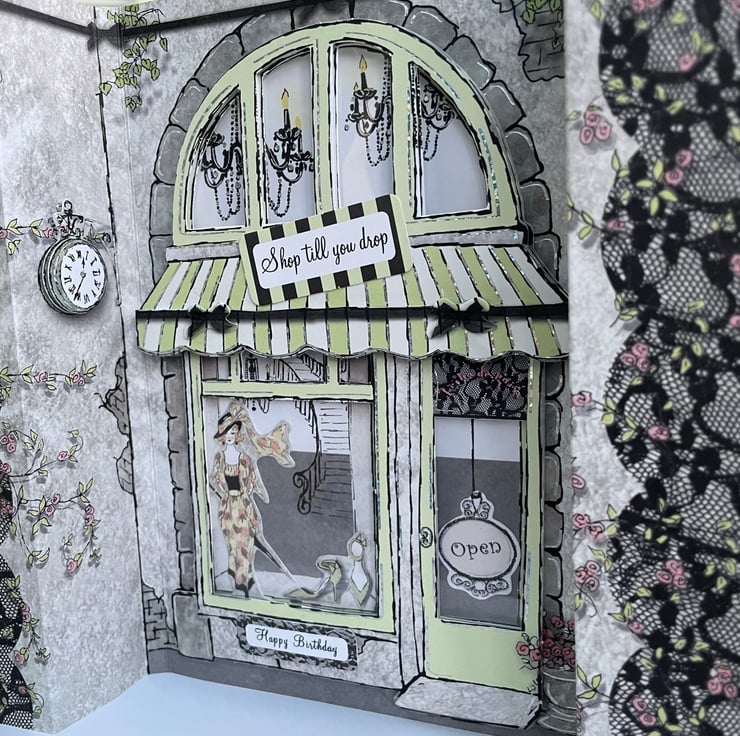 Ooo la la, such an elegant shop, who wouldn't wnat to slip intp this boutique and buy a little something? Such an elegant card to celebrate a birthday. This design is of a shop front complete with stripey canopy, chandeliers, a sweepig staircase and devine fashions. The card is approximately A5 in size and folds to cover the shop front. The fronage is multilayered with windows showing the inside of the shop. There is lace detailing, a clock, trailing flowers and brickwork. Altogether a glamorous way to celebrate.