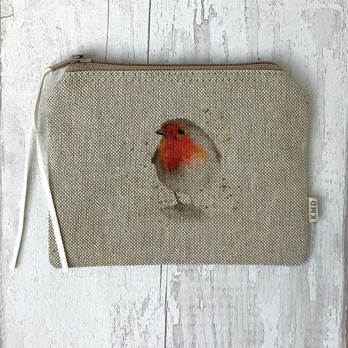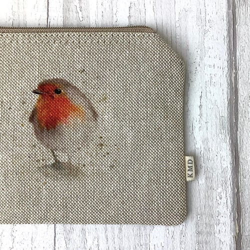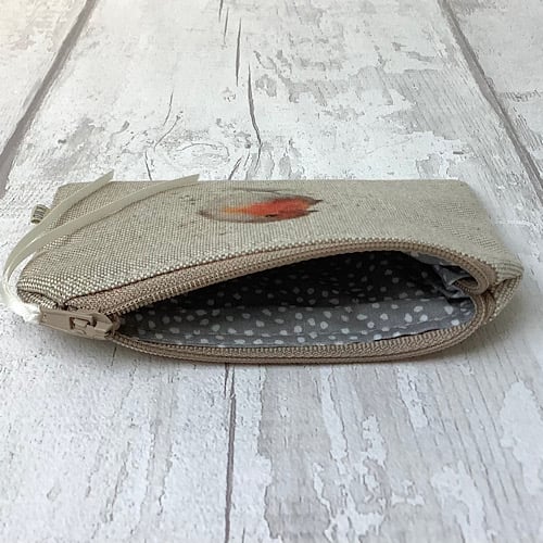 Pretty coin purse in a natural fabric with a pretty red robin print. Lined in grey spot cotton with a beige zip. This purse measures 9.5cm high by 12.5cm wide. Other items available in this fabric.