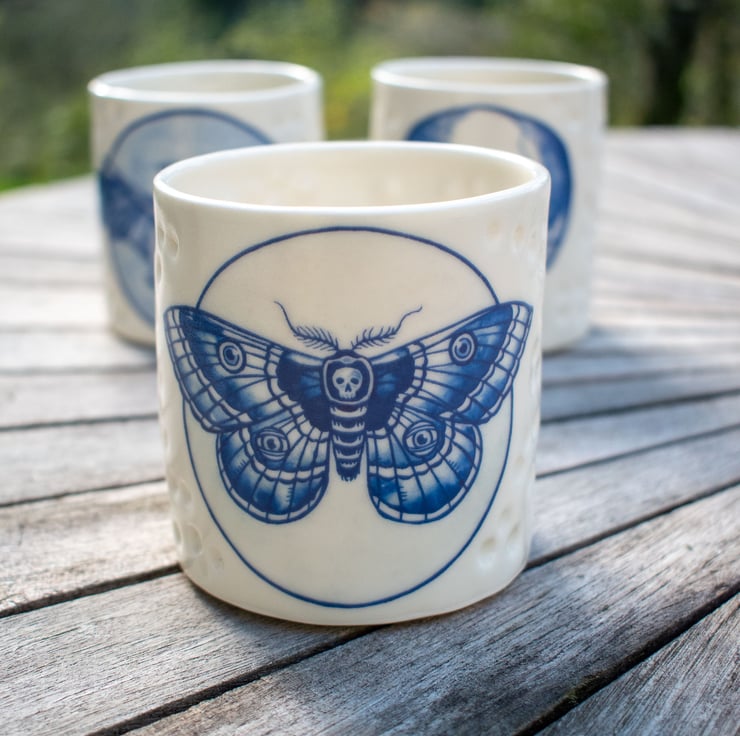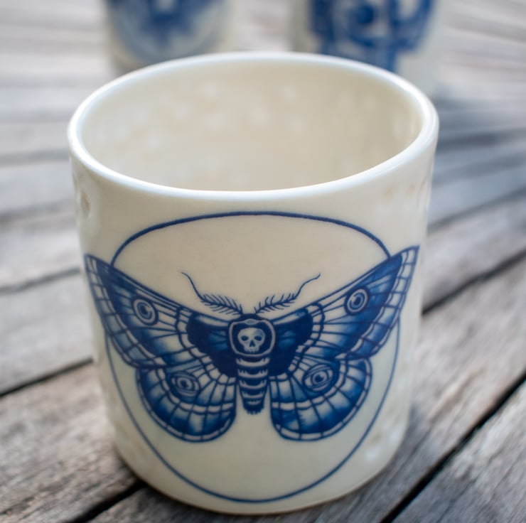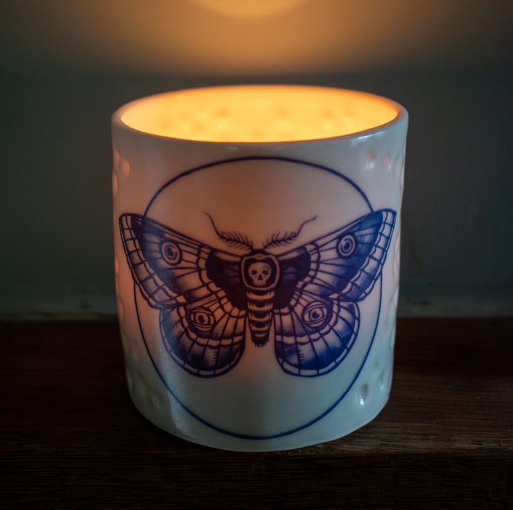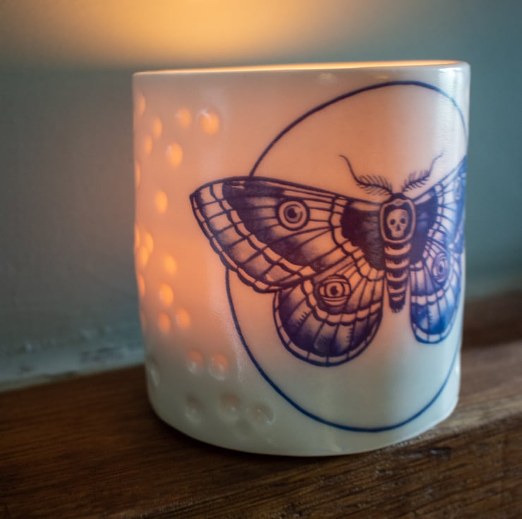 Original illustration is from a collaboration with houseofhawks, the image is taken from his original watercolour and fired to fuse onto my pottery in a third firing. Fired to 1260 degrees - strong, robust and beautifully finished pottery votive.
