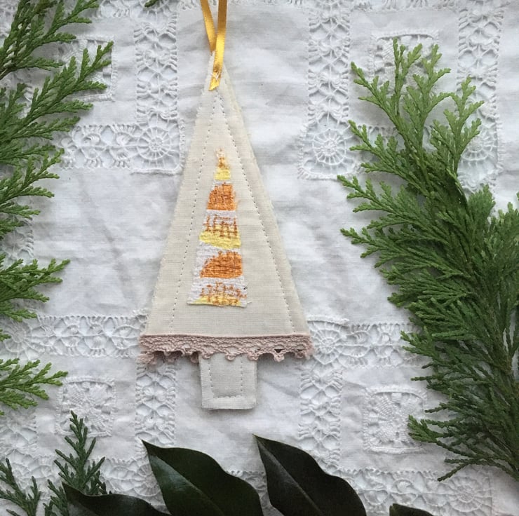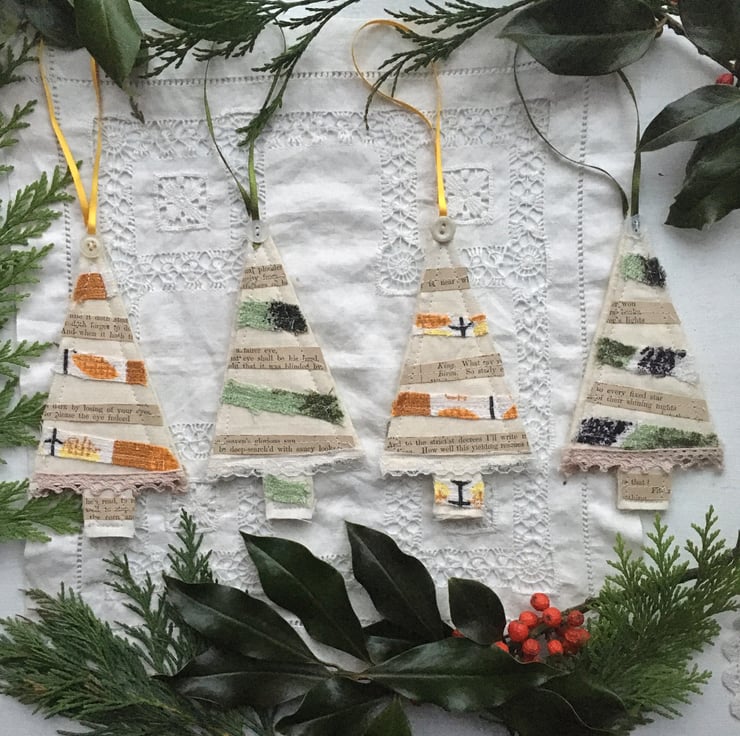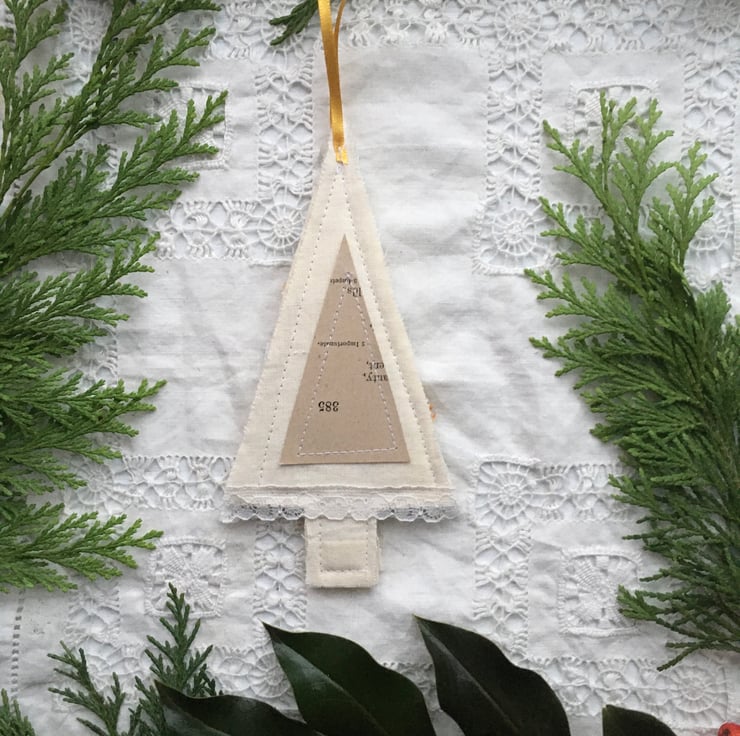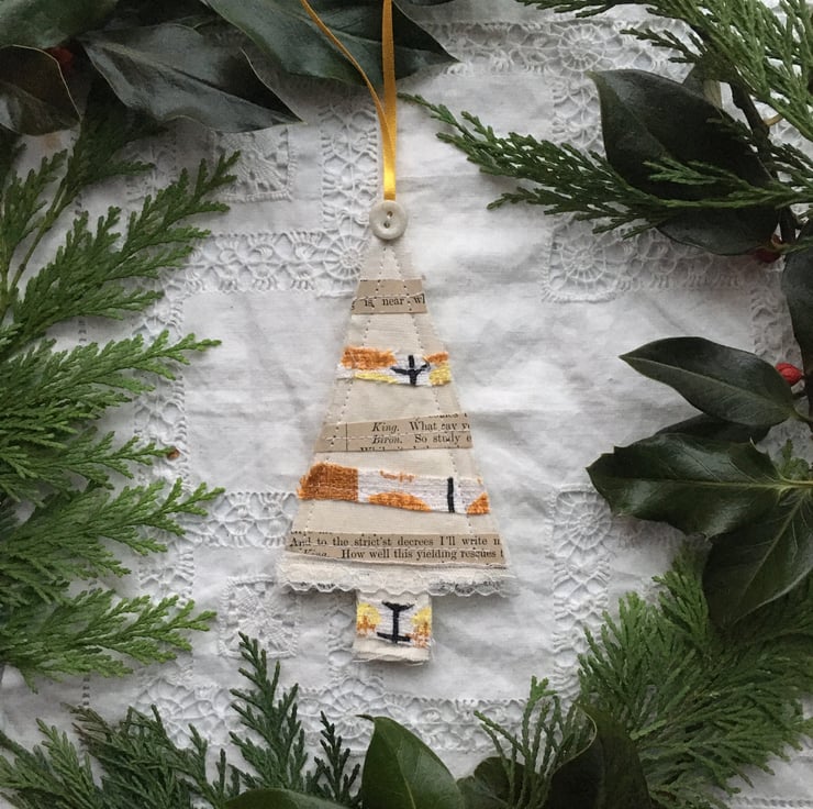 Hanging Christmas tree ornament. Made from thick pure wool felt with vintage fabric, trim and antique book paper details. Finished with a ribbon to hang it and a tiny button.