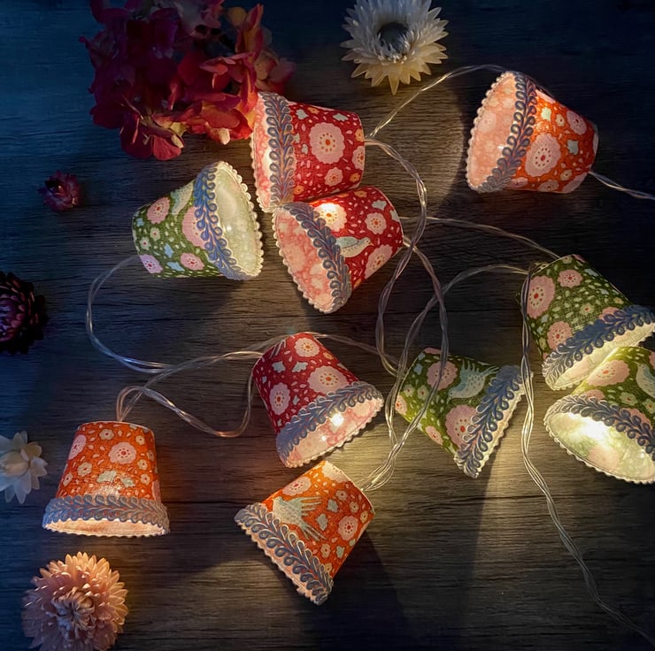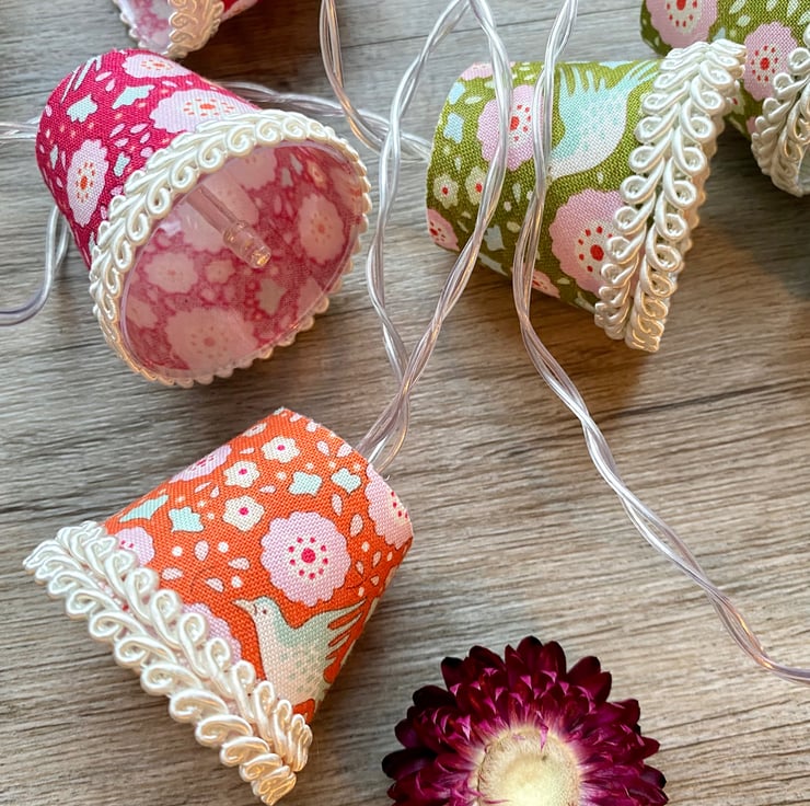 These mini lampshades are perfect to drape along a mantlepiece or shelf, around the head of a bed, or strung across a mirror or picture frame.