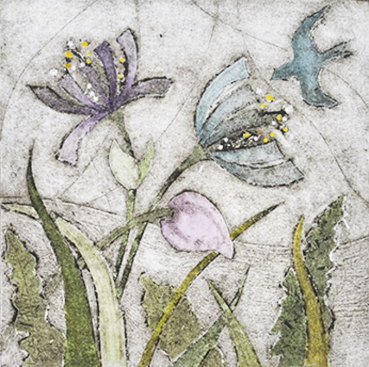 A beautiful handmade Collagraph printed on Fabriano 300 gsm weight archival paper with Caligo oil based ink and finished by hand tinting with artist quality watercolours.
