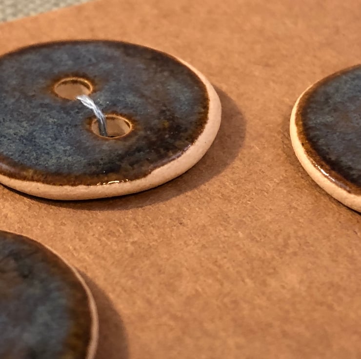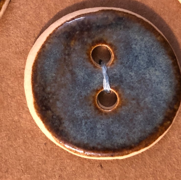 The buttons are bisque fired before being glazed. They are then fired a second time to stoneware temperature which gives them great strength and allows them to be machine washed. The sides and backs are not glazed, leaving them with a natural ceramic finish.