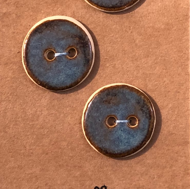 These round buttons were handcrafted and fired in my small home studio. They were finished with a rutile blue glaze. As each individual button is handcrafted, no two buttons will be exactly the same.