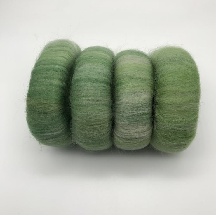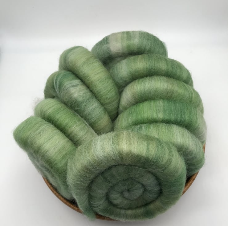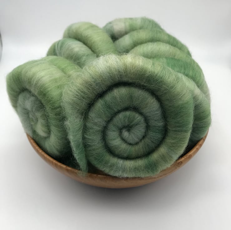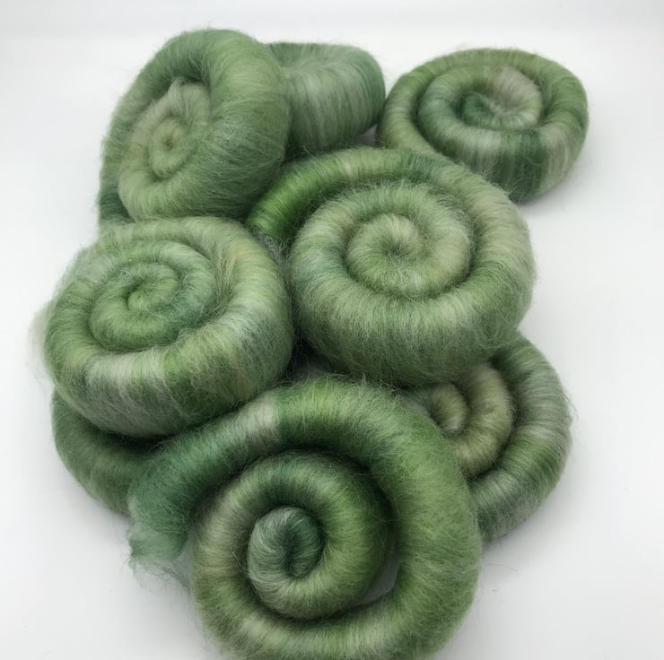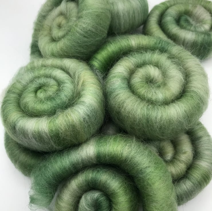 Each rolag has a lovely feel to them with green Corriedale & mixture of sage, grass & light green in Merino. Corriedale has a crimp that gives the fibre loft and elasticity. Both fibres are gorgeous to spin with.